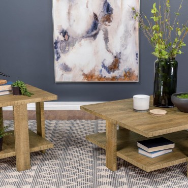 An effortless look of organic simplicity adds intrigue to your casual modern space, offering a place to display and serve as needed. This square end table is built of mango finish laminate veneer over engineered wood with an authentic rough sawn look. Rustic and inviting, it suits your thirst for style and functionality with two surfaces. Wide board-like legs complete its linear design. Embrace a crisp vibe in a side table devoted to earthy organic beauty.