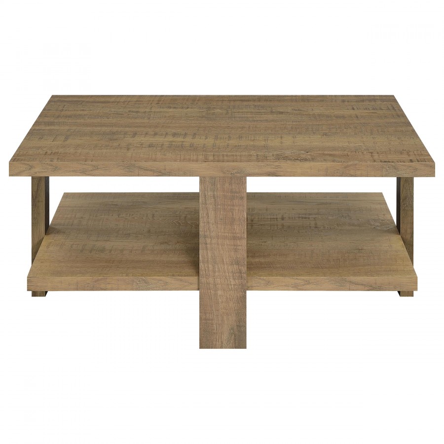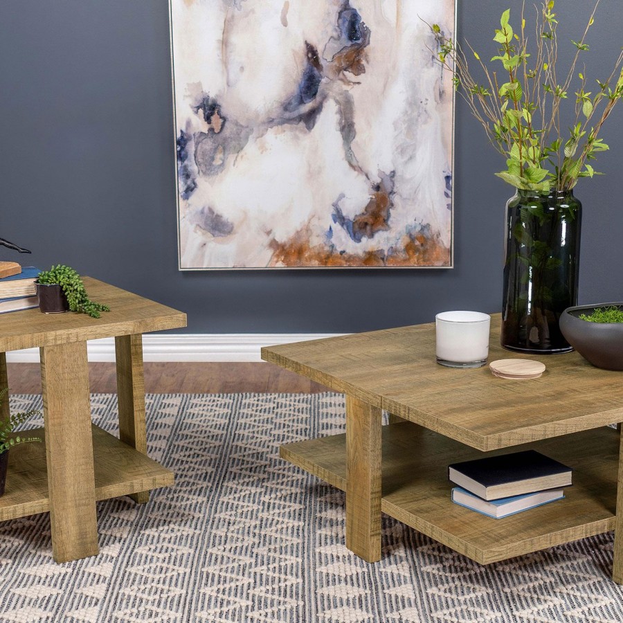 Make a change in your casual space with a coffee table reflecting a perfect blend of structure and nature. Built of engineered wood, laminate veneer, and given a mango finish, this square cocktail table offers plenty of surface space on two layers, ideal for serving, display, and game-playing. Enjoy realistic rough sawn characteristics adding fresh natural vibes. Wide legs surround the dual-surface table, adding to an architectural motif. An easy design of clean lines offers timeless style with versatility.