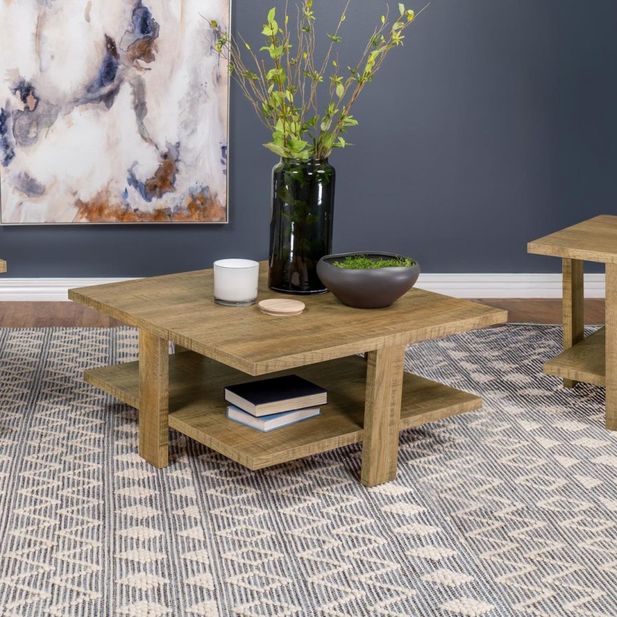 This coffee table set features a perfect blend of clean lines and natural beauty. Each table in the set is crafted from engineered wood with a mango finish and a rough sawn texture, offering two practical surfaces. The wide, board-like legs enhance the linear design, adding a rustic touch. Designed with versatility in mind, this set offers ample space for display, serving, or storage while bringing earthy charm and modern functionality to any living room.