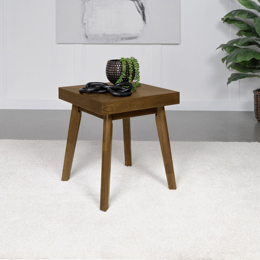 This end table, a quintessential piece of mid-century modern design, boasts a square silhouette that marries sophistication with strength. The walnut brown finish accentuates the intricate parquet veneer, inviting a second glance and a touch to feel its textured top. Its substantial presence is softened by the geometric beauty and the warm tones that whisper of a bygone era's charm and craftsmanship. As a standalone piece or an accompaniment to a sofa, this table is not just a surface, but a story, a slice of design history that enriches the narrative of your home.