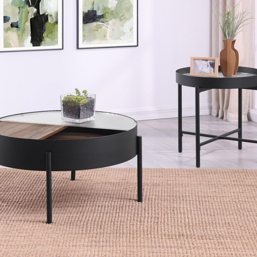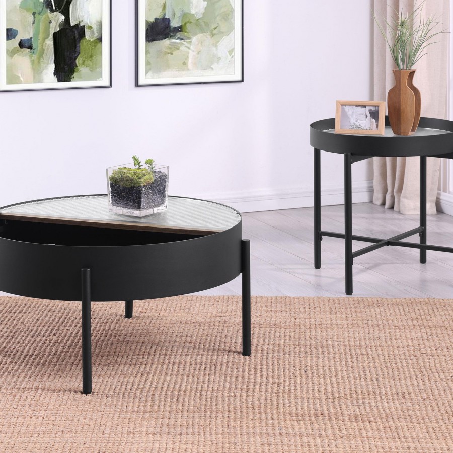 This sophisticated coffee table set seamlessly blends modern design with functional versatility. The coffee table features a dynamic two-tone top with tempered reeded glass and a sliding wood surface that reveals hidden storage. Its sturdy black metal frame ensures durability, while the end table’s sleek construction and reeded glass top add a refined touch. Finished in a sandy black powder coat, this occasional table set enhances any living room with contemporary style and practical elegance.