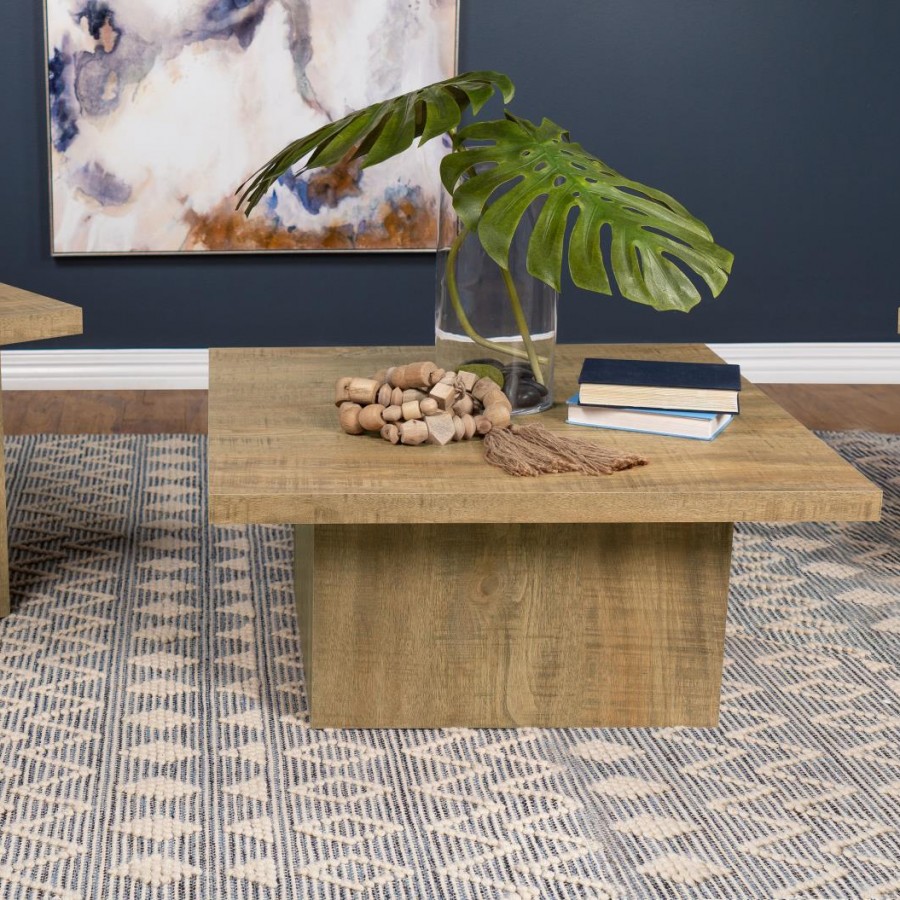 This coffee table set combines the natural beauty of engineered wood with a rustic mango finish. The sleek, square tables feature clean lines and oversized block bases, providing a sturdy and stylish design that enhances casual living spaces. The laminate veneer offers a wood grain appearance, reflecting an earthy, organic vibe that works well in relaxed, contemporary rooms. These occasional tables are ideal for creating a cohesive and functional centerpiece in your living area.
