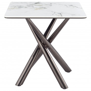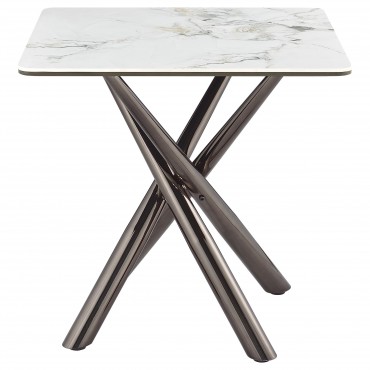 Elevate your living room style with this refined end table. Its sintered stone top layer, set over black tempered glass, exudes modern luxury. Supported by a steel asterisk base in a black nickel electroplated finish, this accent table embodies both sophistication and durability. As a versatile side table, occasional table, or utility table, it gracefully enhances any space, merging elegant aesthetics and practical functionality.