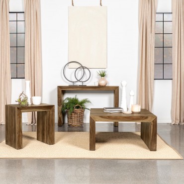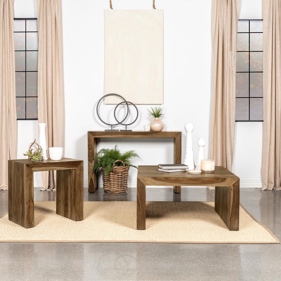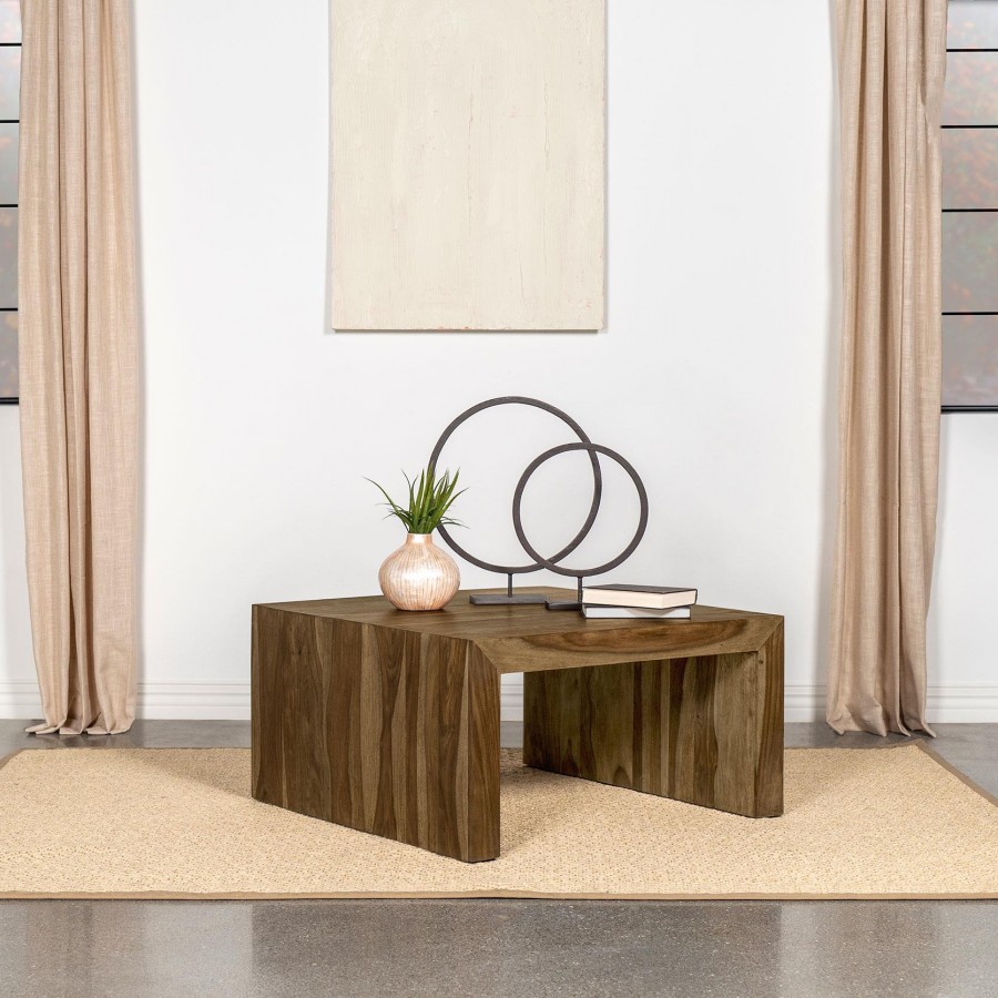 This square coffee table adds an earthy, organic vibe to any living space with its rustic charm. Crafted from sustainable solid sheesham wood, the table boasts an auburn finish that enhances its unique grain patterns. The U-shaped modern silhouette with mitered corners reflects minimalist design with artisanal detail. Its sturdy construction and no-assembly design make it a perfect cocktail table or practical addition to a cozy living room.