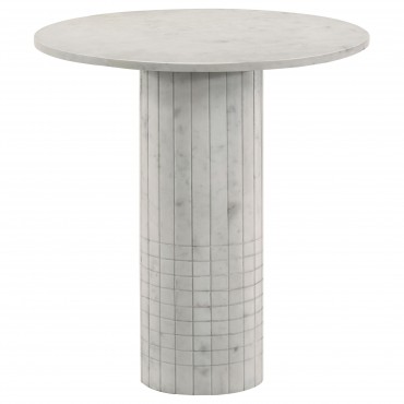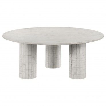 This coffee table set, featuring a coffee table and end table, showcases genuine white marble surfaces and cylindrical pedestal bases. The fluted and grid-textured design adds a refined architectural touch, blending classic elegance with modern minimalism. Perfect for creating a cohesive look in your living space, these tables are crafted for durability and timeless appeal. Ideal as functional and decorative pieces, this occasional table set brings sophistication to any contemporary or upscale interior.