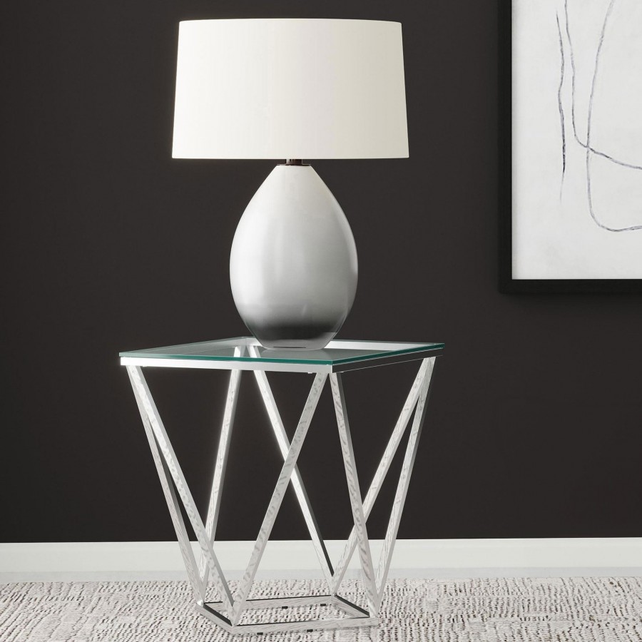 Simple geometric shapes combine to form a strikingly modern end table. The design features open, flared triangles in metal with a gleaming nickel finish, creating a dynamic base. A square glass top offers a smooth, airy surface, perfect for displaying decor or serving cocktails. The square base, rotated to form a diamond, adds an unexpected artistic touch. Perfect for a foyer or as a chic accent in a contemporary seating area, this table enhances any space with elegance and modern style.