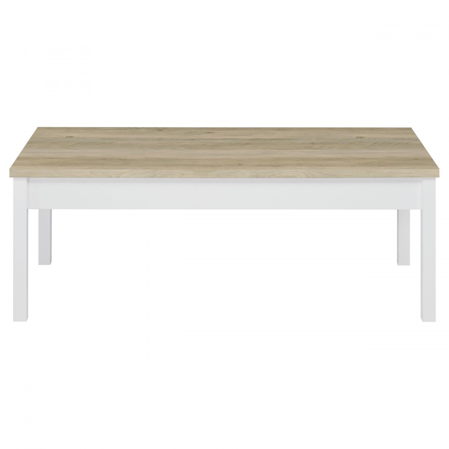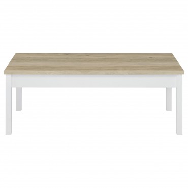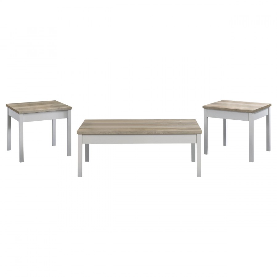 An updated version of farmhouse style is soft and easy on the eyes as this three-piece wood coffee table set is a viable option for your family room or living room. Casual and yet nicely designed, this set offers a versatile finish palette of distressed pine and white over wood products. Clean lines add an easy optical effect. Make your space a simple yet stylish venue with tables designed to last through redesigns. Set includes one rectangular coffee table and two end tables.