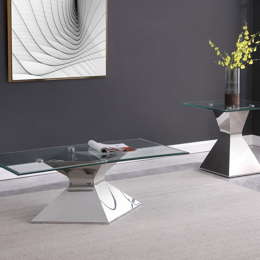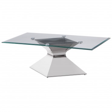 Go bold with this modern coffee table, featuring a polished silver hourglass-inspired pedestal base. Constructed with stainless steel and tempered glass, it includes a rectangular top with a beveled edge for added dimension. The clear glass showcases the geometric curves and angles of the base, enhancing its artistic appeal. Perfect as a centerpiece, this contemporary coffee table offers a striking combination of form and functionality for modern interiors.