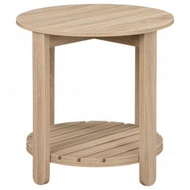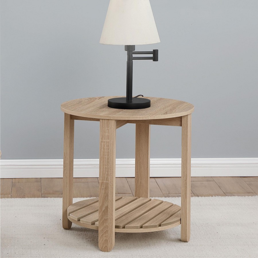 Upgrade your living room seating area with the casual appeal of a modern farmhouse end table, constructed from durable engineered wood and MDF. This charming design features a structured silhouette complete with thick, straight legs and wood-like features for a natural touch. The round tabletop, perfect for refreshments or a table lamp, adds to its versatility. Below, a slatted shelf offers convenient storage or display space, adding a touch of texture and making this table a charming choice for a sunroom or a covered porch. Its contemporary natural wood finish is versatile, complementing a variety of existing color palettes.