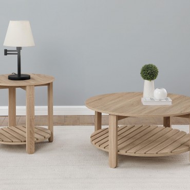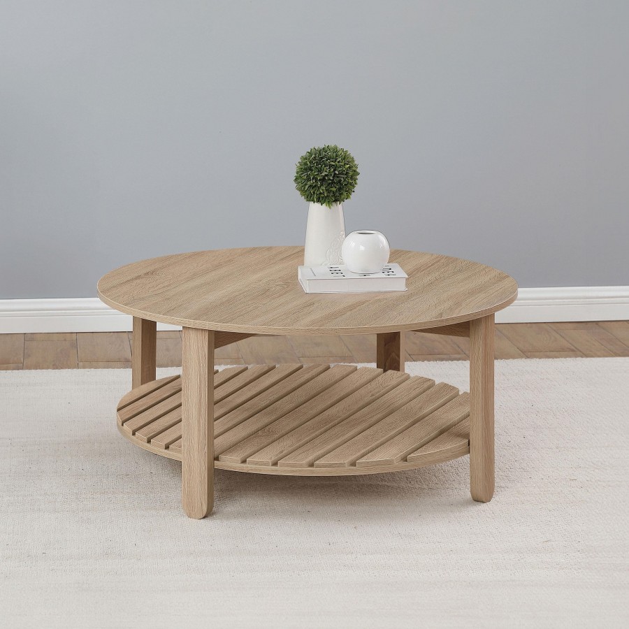 This round coffee table combines modern farmhouse charm with practical functionality. Made from engineered wood with an eco-friendly, scratch-resistant laminate veneer, it features a natural finish and subtle wood grain texture. The round tabletop offers ample surface space, while the slatted lower shelf provides additional storage. Built for durability and everyday use, this table is a stylish and sustainable centerpiece for any living room.