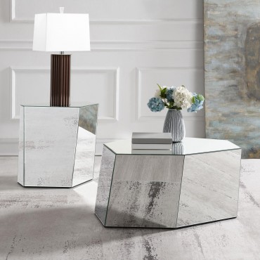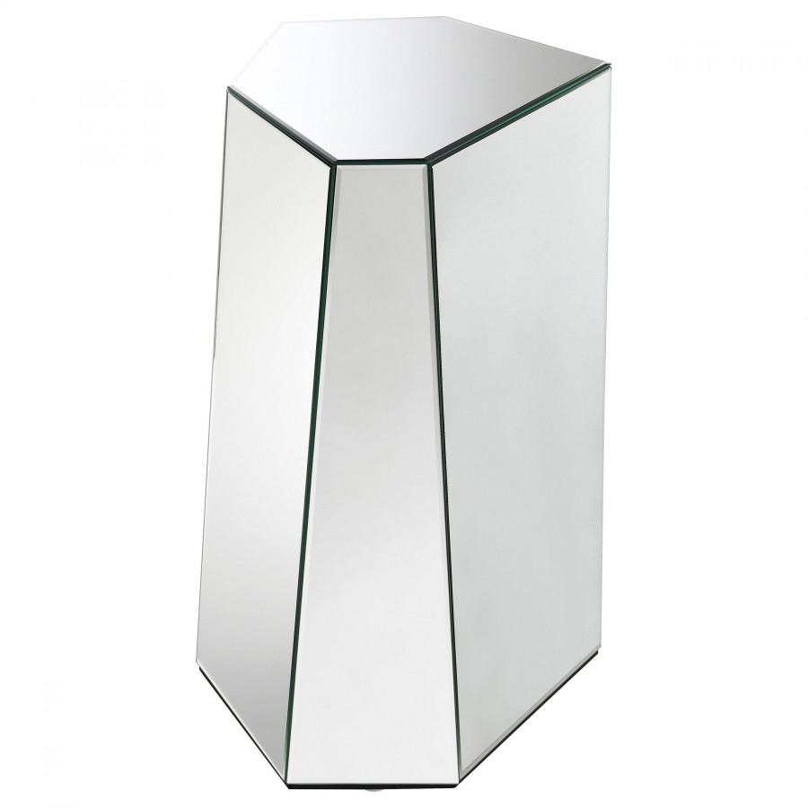 This mirrored end table features a hexagonal silhouette and geometric design for a glamorous contemporary look. Irregular sides add visual interest, while sleek mirrored surfaces reflect light and sophistication. Fully set up and ready to use, this refined piece is perfect for enhancing the style of modern interiors with elegance and functionality.
