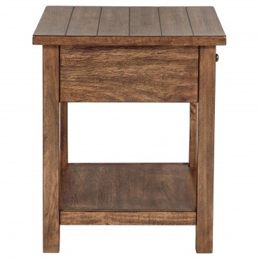 This rustic end table merges classic style with practical storage, making it a charming focal point in any living room. Built from pine wood and reinforced with engineered wood, its square silhouette highlights a subtle, timeworn aesthetic. An integrated drawer keeps items neatly stowed, while the lower shelf offers additional display space. This side table works beautifully as an accent in a modern farmhouse or relaxed, casual setting.