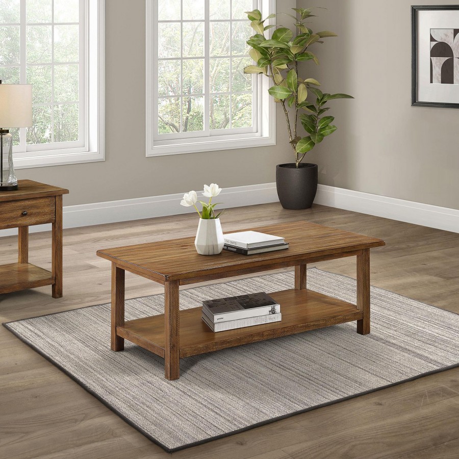 Elevate your living room with this coffee table set featuring a rectangular coffee table and an end table with a built-in drawer. Each piece is crafted from pine wood, engineered wood, and pine veneer for rustic flair and everyday practicality. The coffee table offers room for décor or snacks, while the end table provides discreet storage for essentials. This occasional table set effortlessly enhances farmhouse or casual interiors