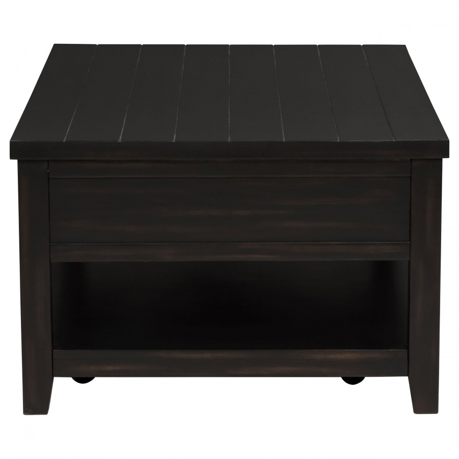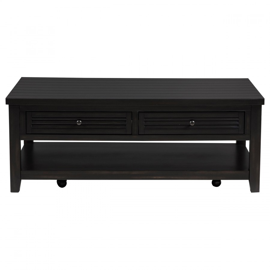 Bring a touch of timeless charm to your living room with this versatile coffee table. Featuring solid wood legs and a beautiful engineered wood frame with a distressed java finish over pine veneer, it offers both durability and style. The planked wood top creates a rustic feel, while the louvered drawer fronts add character and texture. Designed for functionality, the two spacious drawers are accessible from both sides, making it perfect for organizing living room essentials. Whether you need extra storage or a stylish centerpiece, this cocktail table delivers in both form and function.