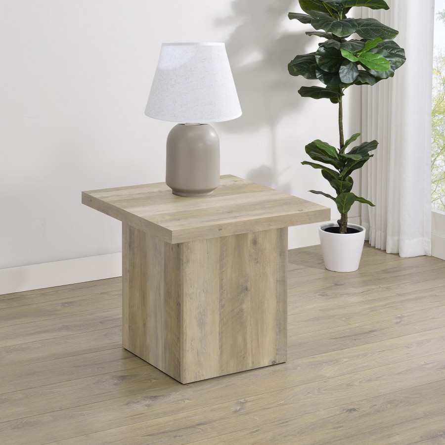 Sculptural and grounded, this end table blends rustic charm with bold geometric lines. A thick square top rests atop a broad plinth-style base, forming a clean, architectural silhouette. The distressed pine finish reveals warm grain patterns that add natural texture and depth. Crafted from engineered wood with a scratch-resistant melamine veneer, this piece brings visual weight and organic simplicity to living rooms, lounge areas, or quiet corners.