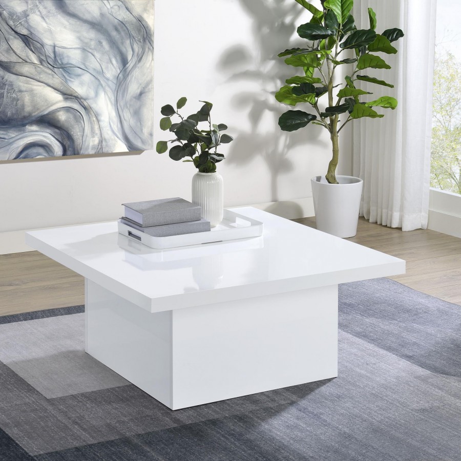 With bold geometry and a radiant finish, this coffee table offers sleek structure and brightness. A thick square top floats over a broad plinth base, creating a grounded yet sculptural silhouette. The white polyurethane high gloss finish reflects light beautifully and enhances modern appeal. Made from engineered wood, it’s a functional and elegant cocktail table for glam, minimalist, or open-plan living areas.