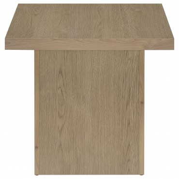 Designed for balance and modern edge, this end table brings bold structure to any space. Its blocky square profile is enhanced by a thick top and sleek brown finish. Built from engineered wood with a textured laminate veneer, the surface replicates natural wood grain with a refined touch. Whether used as an accent table or occasional piece, it offers functional elegance with a graphic form.