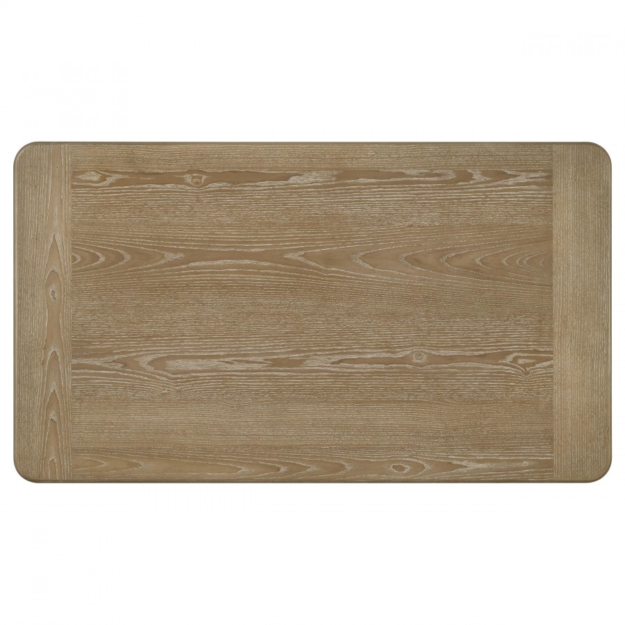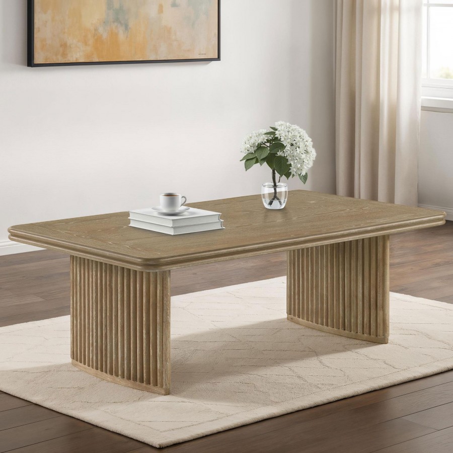 This rectangular coffee table brings sculptural structure and natural warmth to any living room. The rounded-edge tabletop rests on dual curved pedestal bases, each detailed with vertical reeding for visual rhythm and balance. Finished in a distressed light brown tone, the piece blends organic texture with architectural design. Built from engineered wood and ash veneer, this coffee table serves as a grounding focal point for contemporary and transitional spaces.