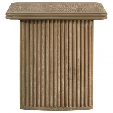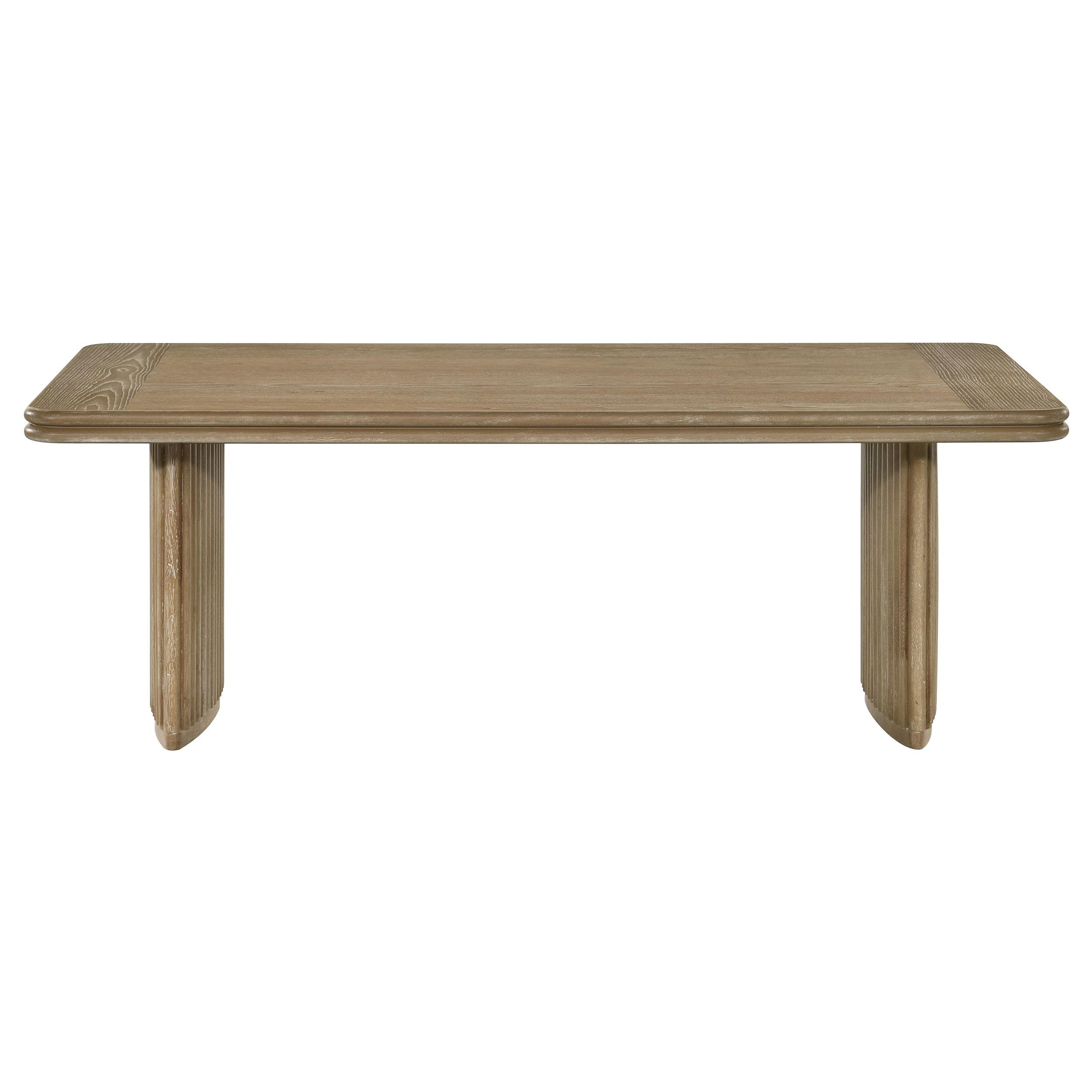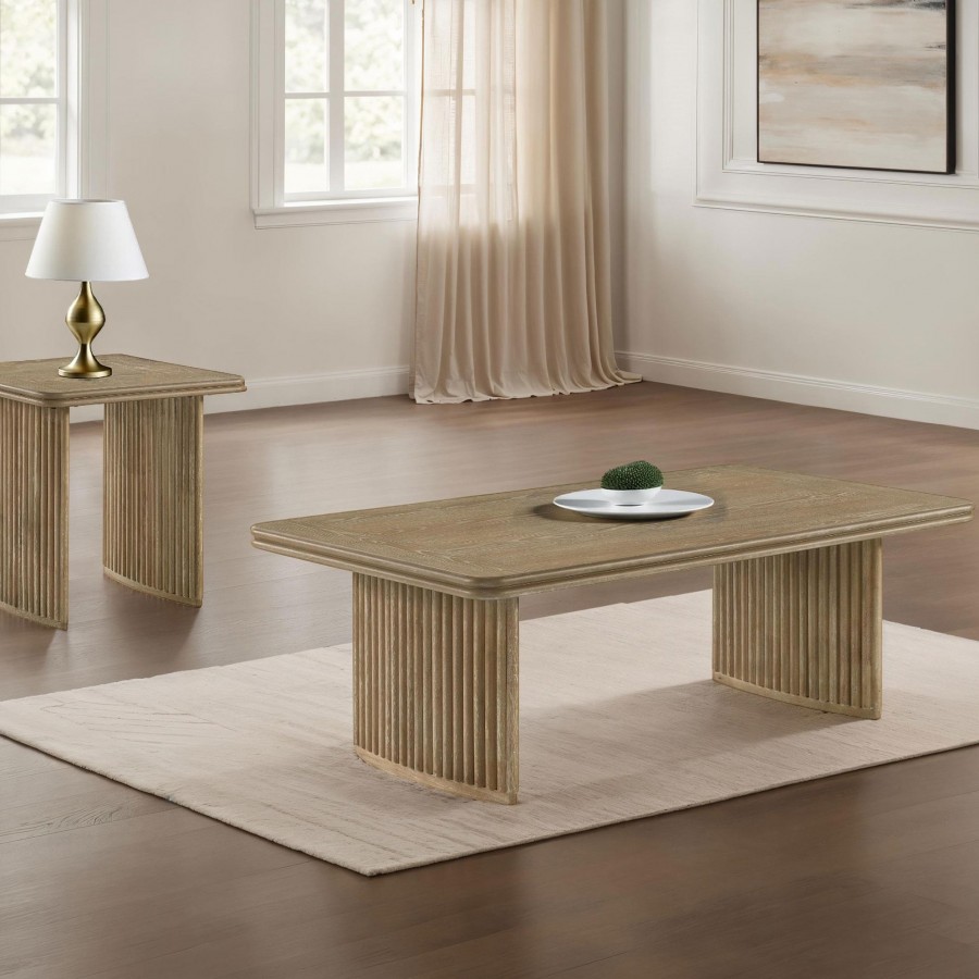 This sculptural coffee table set blends architectural rhythm with natural warmth through its curved pedestal bases and reeded detailing. The rectangular coffee table and square end table feature rounded corners and rich wood grain texture, finished in a distressed light brown tone that enhances their organic appeal. Crafted from engineered wood and ash veneer, this set brings lasting structure and visual harmony to both contemporary and transitional living spaces.