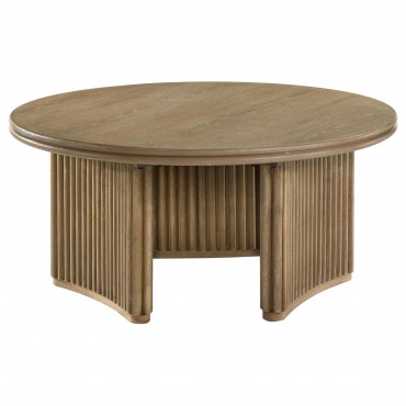 This round coffee table set pairs sculptural shape with organic finish for a refined living room statement. Featuring a thirty-six inch round coffee table and a matching round end table, both with curved pedestal bases and vertical reeding, the set offers warmth and architectural dimension. Finished in distressed light brown and built from engineered wood and ash veneer, the design balances modern softness with natural texture.