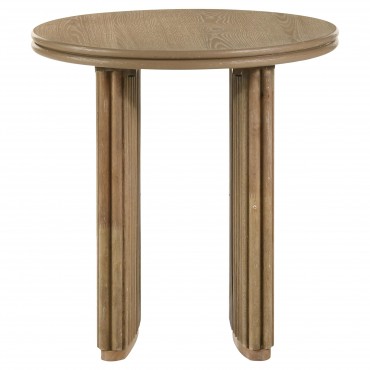 This round coffee table set pairs sculptural shape with organic finish for a refined living room statement. Featuring a thirty-six inch round coffee table and a matching round end table, both with curved pedestal bases and vertical reeding, the set offers warmth and architectural dimension. Finished in distressed light brown and built from engineered wood and ash veneer, the design balances modern softness with natural texture.