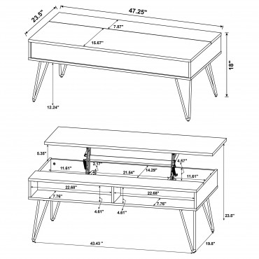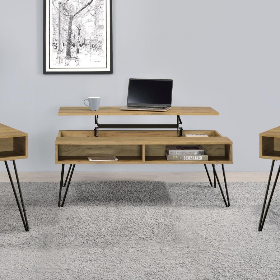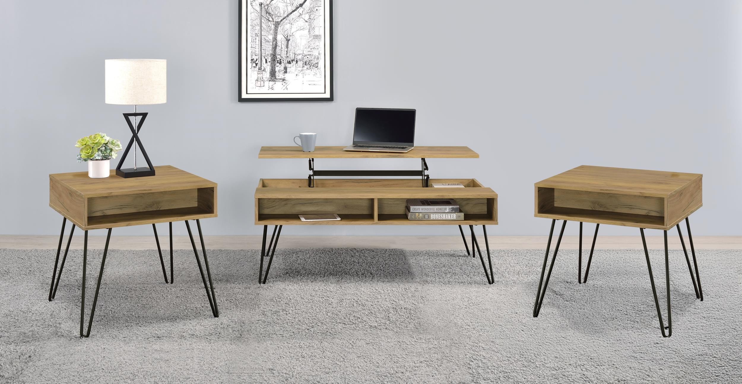 This coffee table and end table set combines practicality with contemporary design. Tables are crafted from engineered wood with a scratch-resistant, eco-friendly laminate veneer in a warm golden oak finish. The coffee table features a lift-top for hidden storage, while the end table includes an open shelf for everyday organization. Supported by sleek black hairpin legs, this versatile set adds industrial-modern charm to any living space.