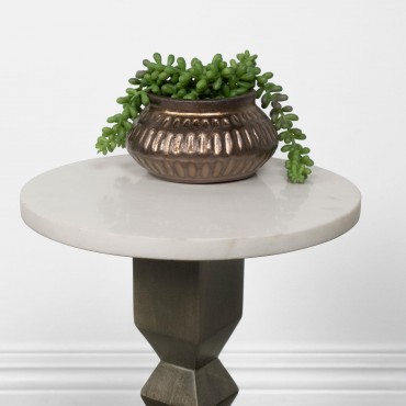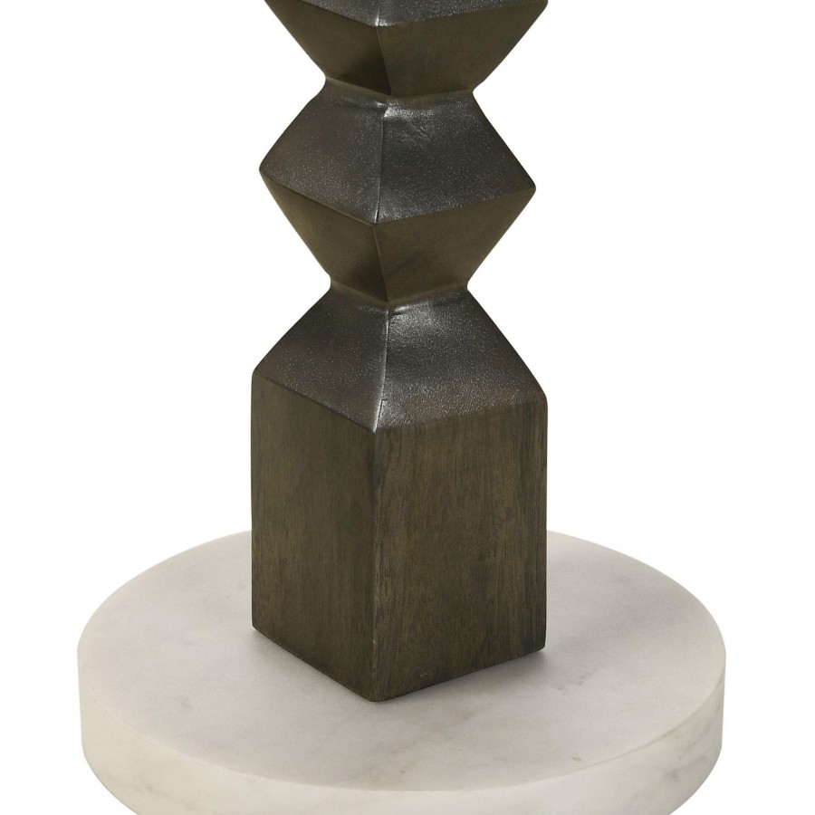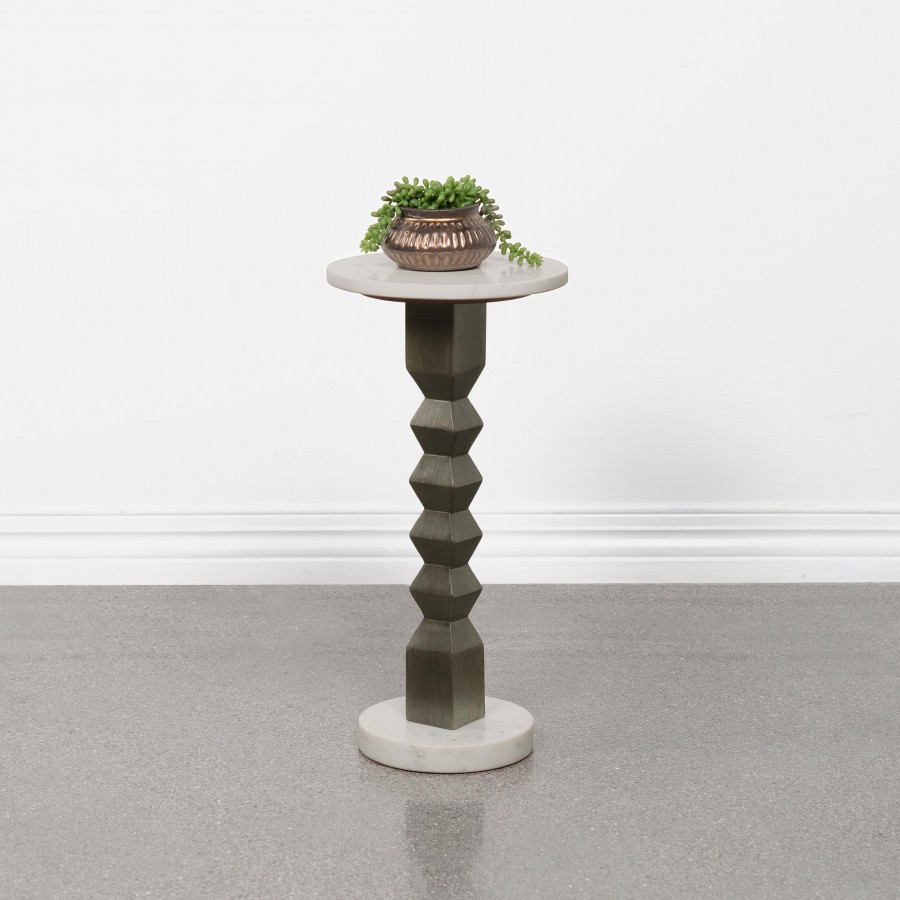 Put a kick in casual home décor with a style that suits your whim. This side table offers a charming design and a contrasting palette, perfect for accentuating a contemporary space. A crisp geometric motif takes a page from Old World aesthetics in a table featuring a dark gray mango wood pedestal with an eye-catching stacked cube design. A round white marble top and matching base contributes a hint of glam to upgrade your timeless living style. This table is an excellent choice for both serving and displaying plants or décor.