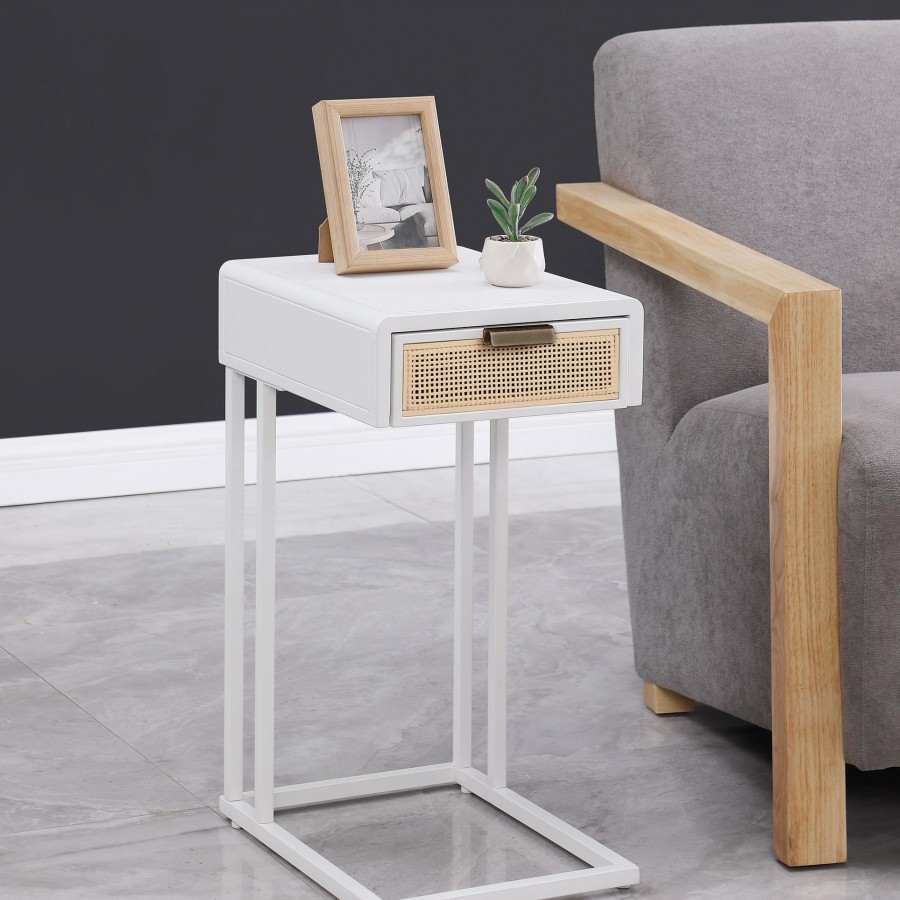 This C-shape side table effortlessly combines style and functionality, making it the perfect accent for your living space. Constructed with a sturdy heavy gauge metal frame, it offers lasting durability while maintaining a sleek, modern profile. The single drawer features a polyethylene (PE) rattan front, adding a touch of natural texture and charm. Its C-shape design allows it to slide easily under sofas or chairs, providing convenient surface space where you need it. This side table is both practical and stylish, ideal for any contemporary home.