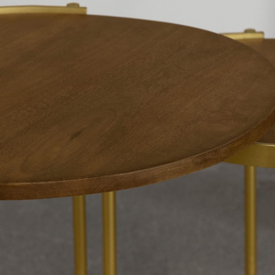 Soft gold adds an element of warmth to a two-piece set of modern nesting tables. Charming in a compact living space, the smaller table tucks under the larger to create a waterfall effect that's sure to catch the eye. Each table boasts a perfectly round tabletop of dark brown finish mango wood that adds earthy elegance. Clean lines define iron bases that include X-braces that add both stability and a stylish touch. These nesting tables are made in India with excellent craftsmanship that bring welcoming character in your living room.