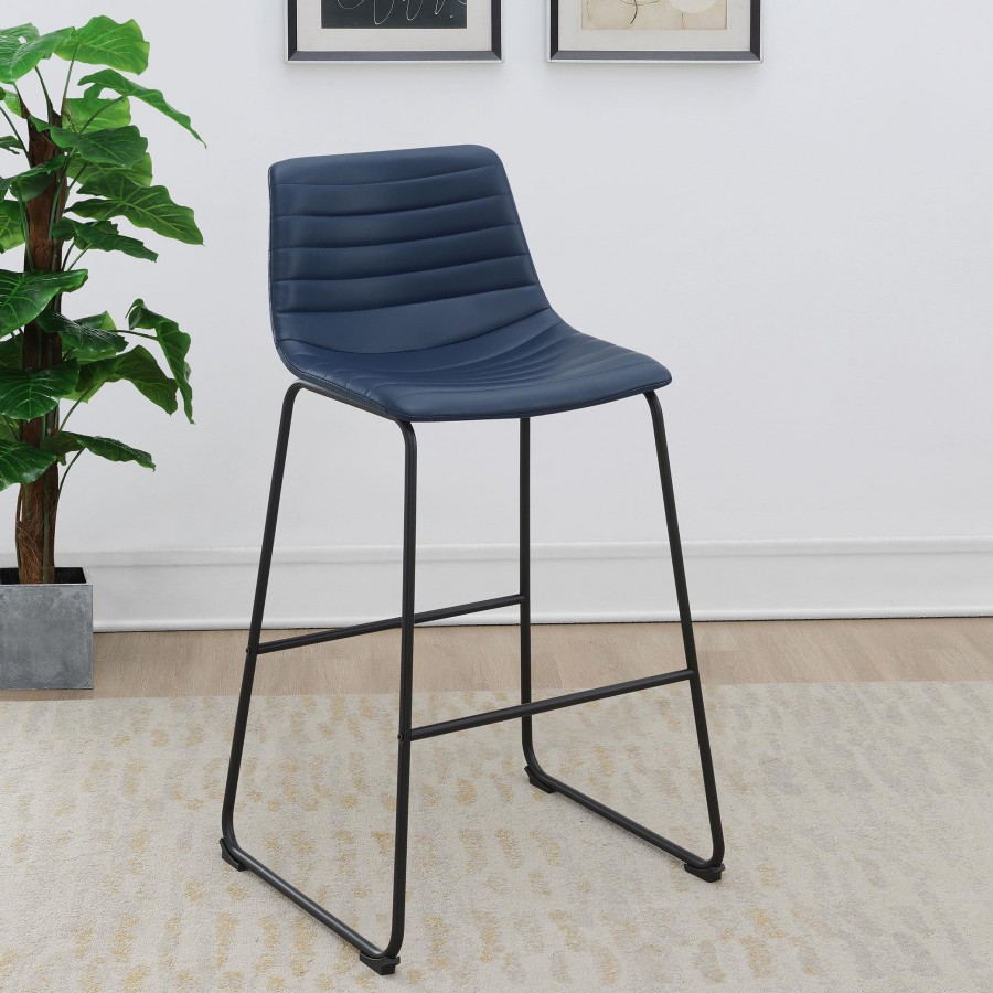 Upgrade kitchen or lounge seating with the refined look of a set of two contemporary barstools. Each boasts faux leather upholstery over a bucket style seat. Channel tufting adds a sense of depth and movement while highlighting intriguing color. The stools stand on black finish metal bases with a sled design and plastic glides to protect flooring. Straight footrests are built into the frame of each stool, adding comfortable support for friends and family.