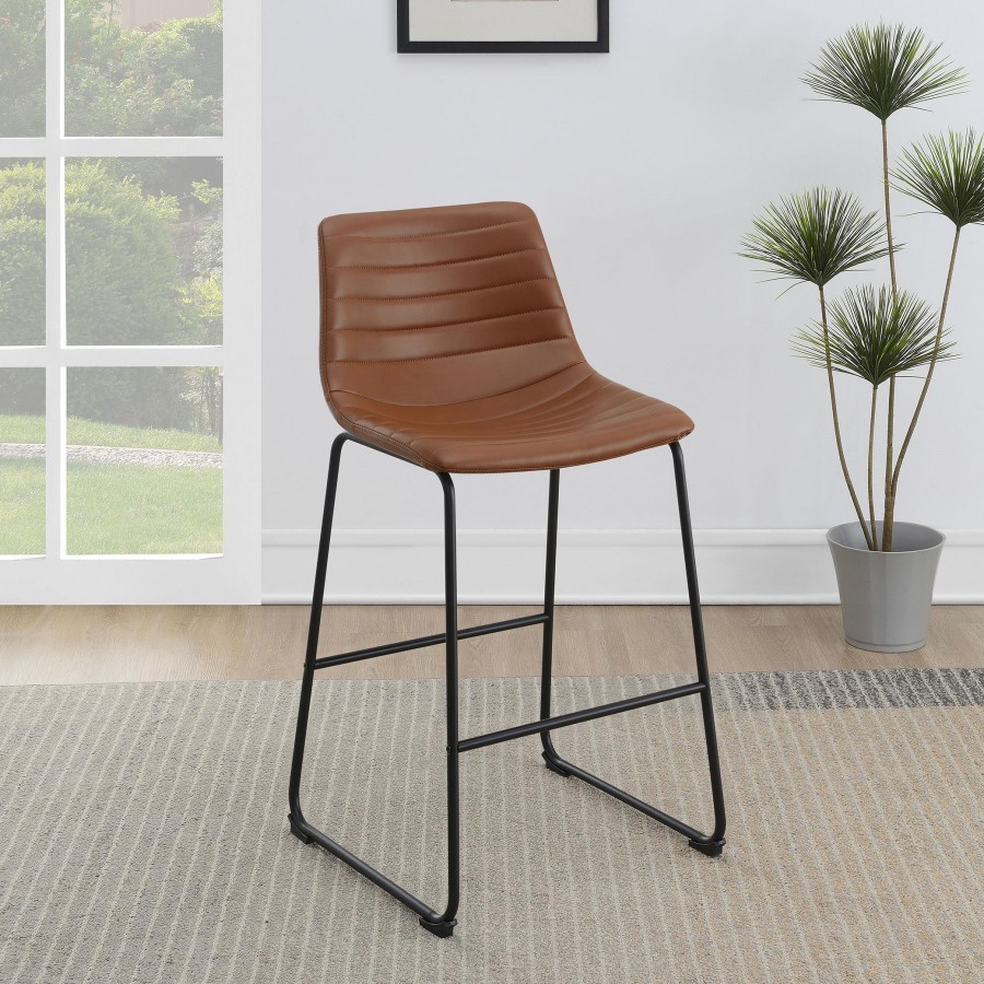 You'll love the upgraded ambiance of a set of two contemporary barstools in your kitchen or home lounge. Each counter stool shows off faux leather upholstery over a bucket style seat for inviting comfort. Beautiful color is highlighted with channel tufting that adds a sense of depth and movement. Footrests straight and smooth, assuring comfortable support for friends and family. Each stool stands on a black finish metal base with a sled design and plastic glides to protect flooring.