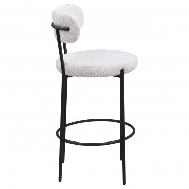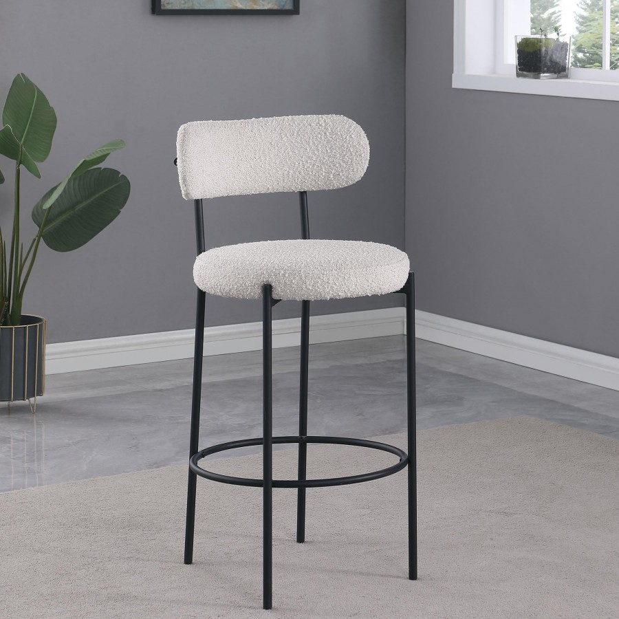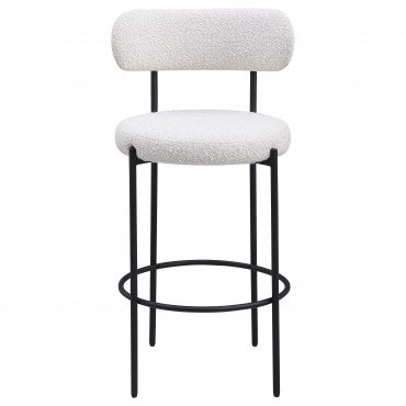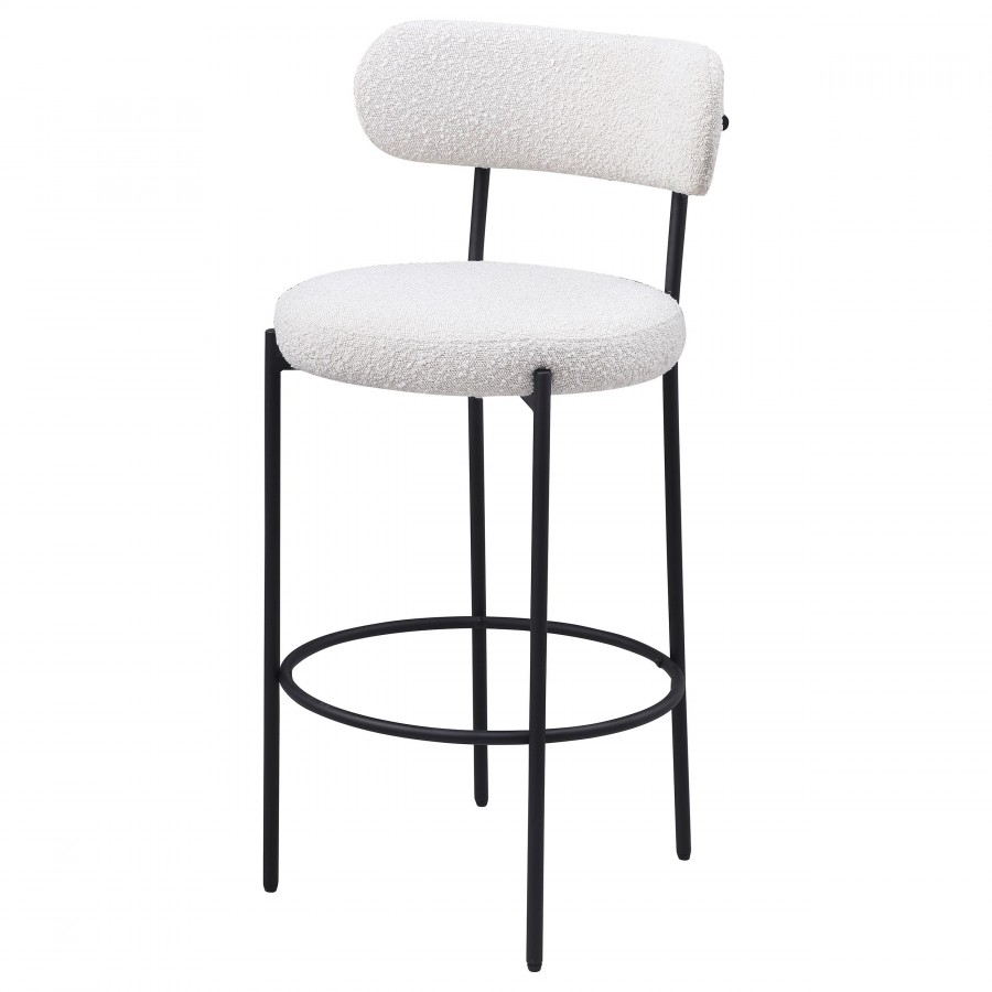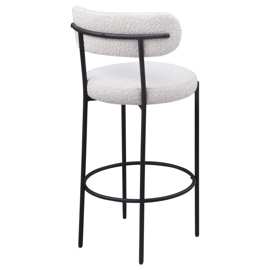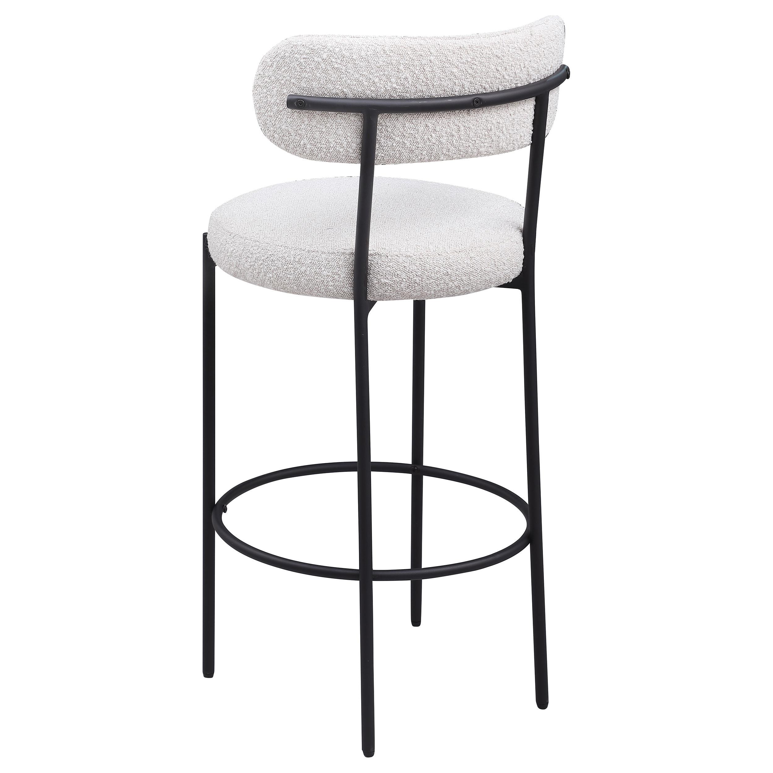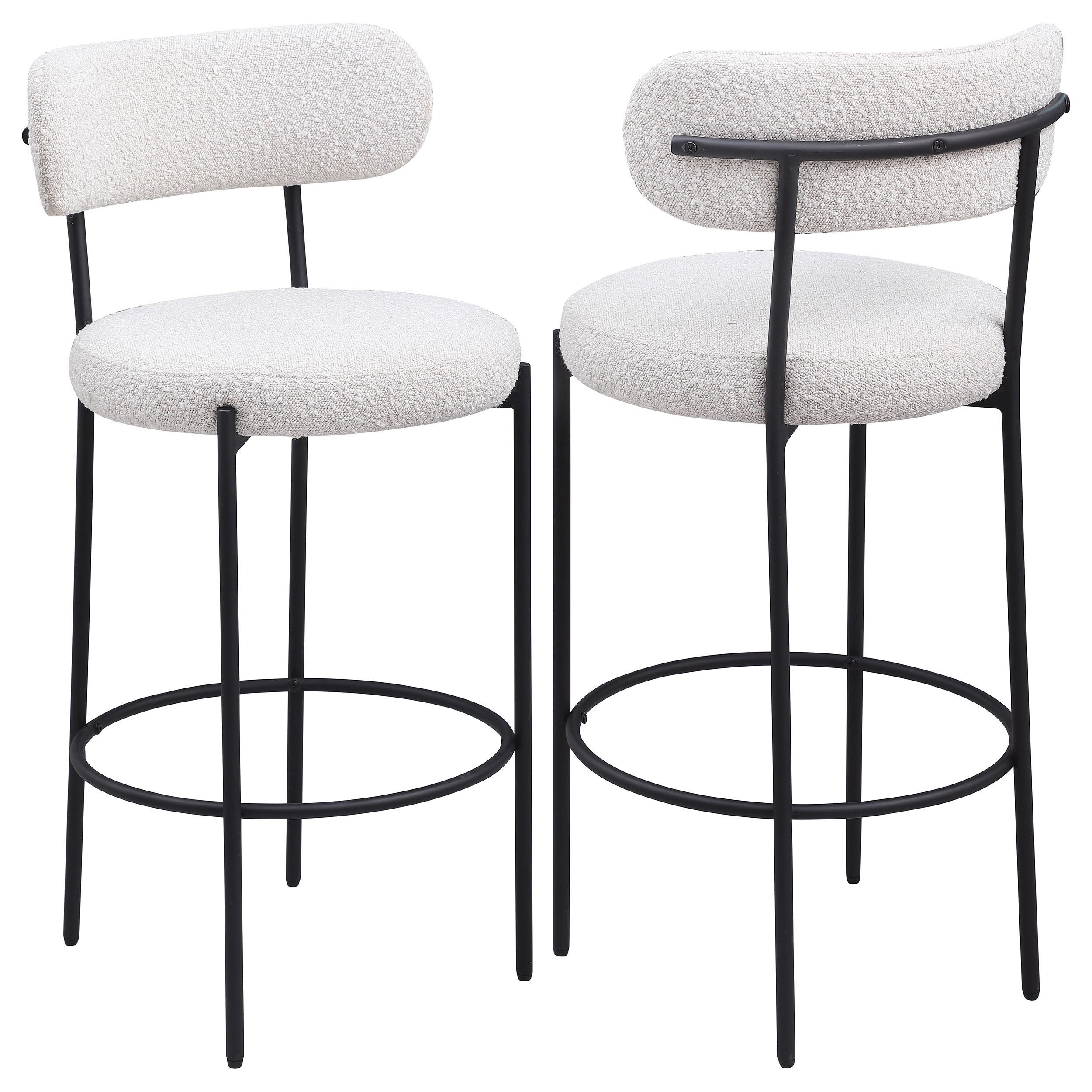 Refresh your kitchen island or elevated bar table with a set of two modern barstools. Each features foam cushions and contemporary boucle upholstery in a neutral hue. Black finish metal framing provides excellent support and durability, while slim legs and supports ensure a chic silhouette. The stools include foam cushions on round seats and curved backrests, offering wonderful comfort for meals and conversation. A ring footrest adds a charming finishing touch and plenty of support.
