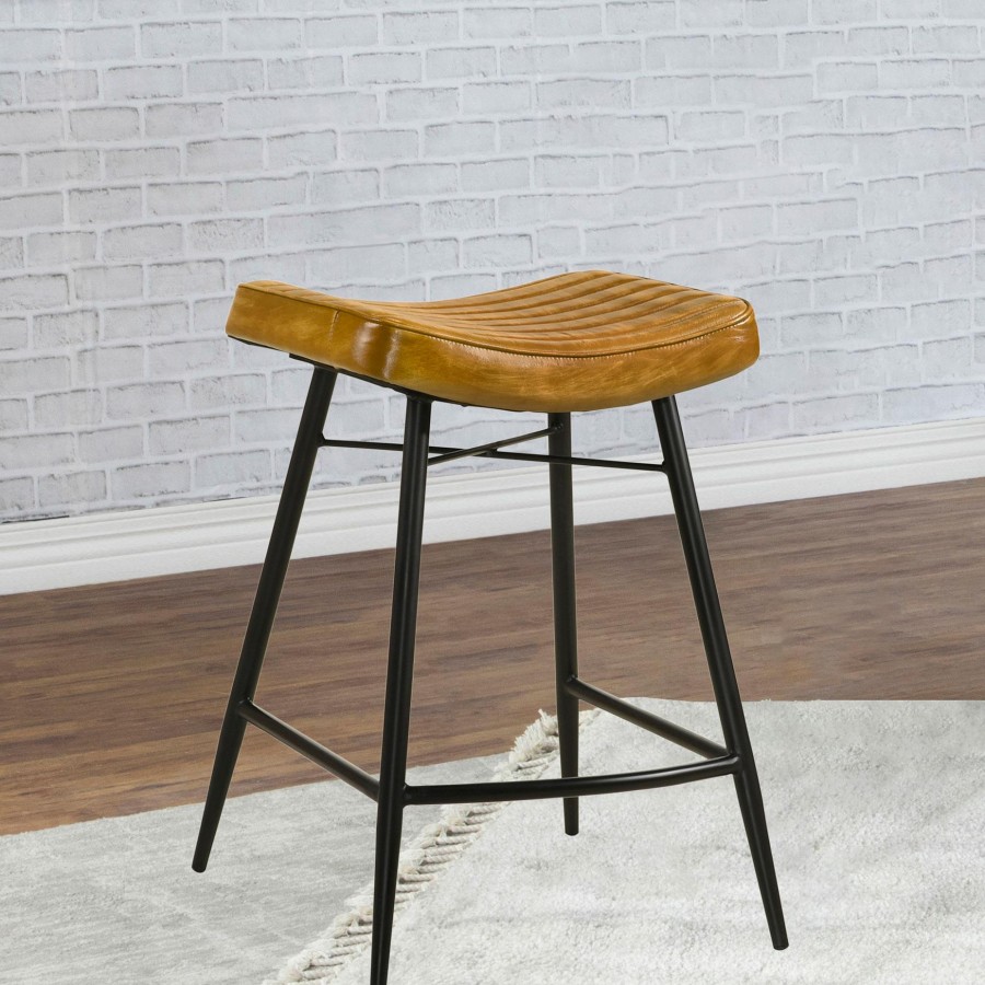 Inject a heavy dose of casual character to your kitchen or bar with the rich antiqued leather upholstery featured on a classic backless stool. Its gently curved seat cradles you in comfort, with channel tufting that adds texture and compelling style. A durable metal base delivers stability for all your seating needs, from a quick cup of coffee in the morning to a leisurely dinner catching up with your favorite person. Flared legs define its silhouette, with an X-cross brace just under the seat adding visual interest and depth. Gently curved footrests and built into the base, perfect for support and style for the whole family.