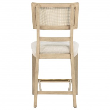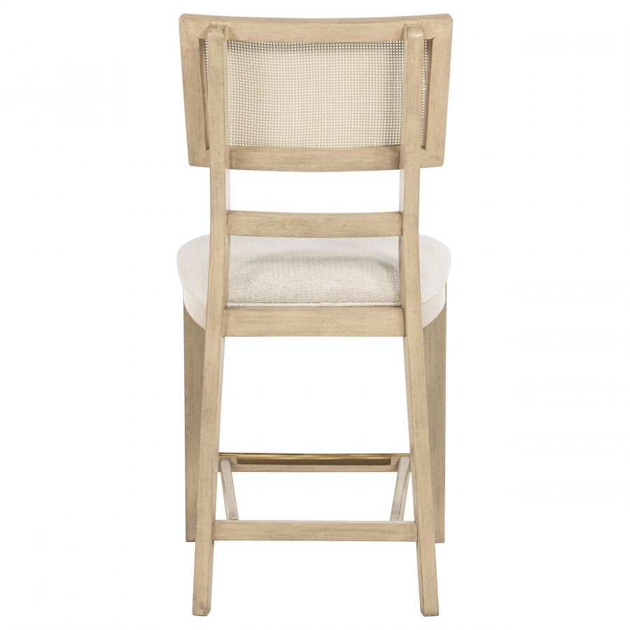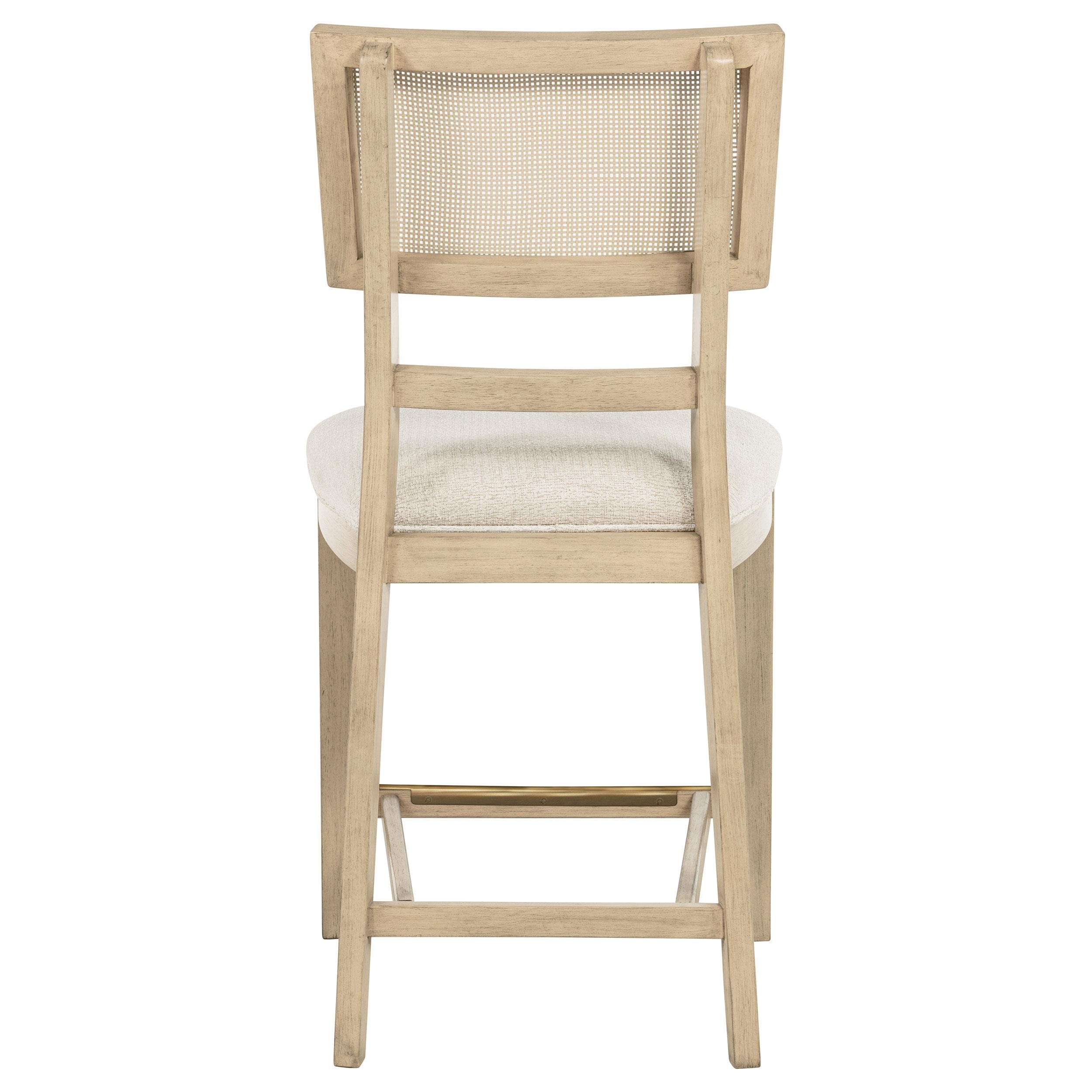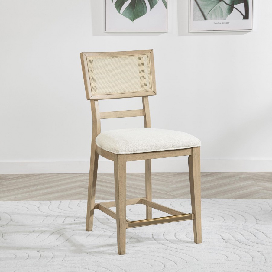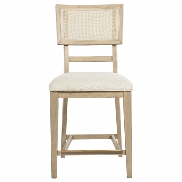 Elevate your dining experience with this stylish counter-height chair, combining natural beauty and modern comfort. Crafted from solid wood, this chair features a hand-woven radio weave cane backrest that adds a light and airy feel to your space. The foam seat cushion, upholstered in soft beige fabric, ensures comfort while dining or entertaining. Designed with clean lines and sturdy construction, this counter-height chair also includes a footrest with a brass-finished metal kick plate for added durability. Perfect for pairing with your counter-height dining table or kitchen island, this chair blends timeless elegance with practical functionality.