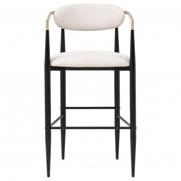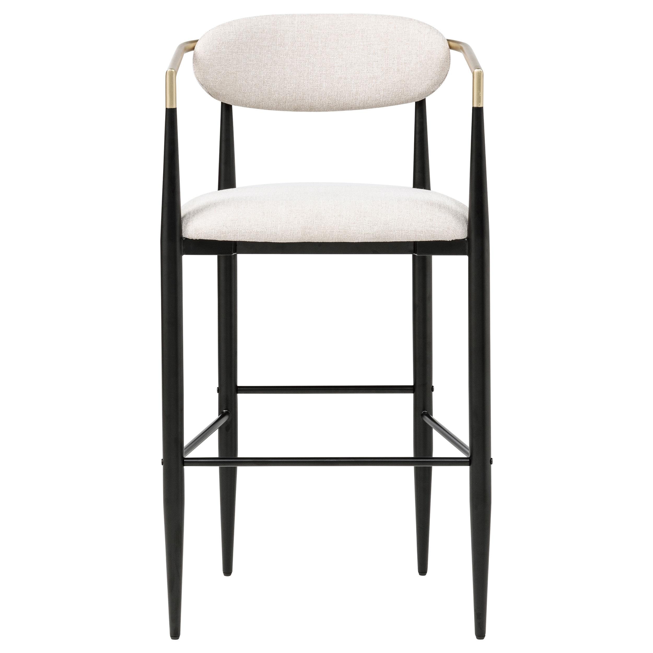 Take your kitchen or dining room decor to stylish new heights with the mid-century flair of a set of two modern barstools. Each offers an airy, open silhouette with its pairing of a plush seat and slender backrest, both with foam cushioning and stylish upholstery. The gentle curvature of the seatback continues in slim arms that receive a gold finish that complements both the fabric and the black finish of the base. The base of each barstool offers tapering legs and slim support bars that create a built-in footrest for added comfort and support. This plush barstool is the ideal solution to a bar table in a relaxed dining room or a home lounge in need of elevated style.