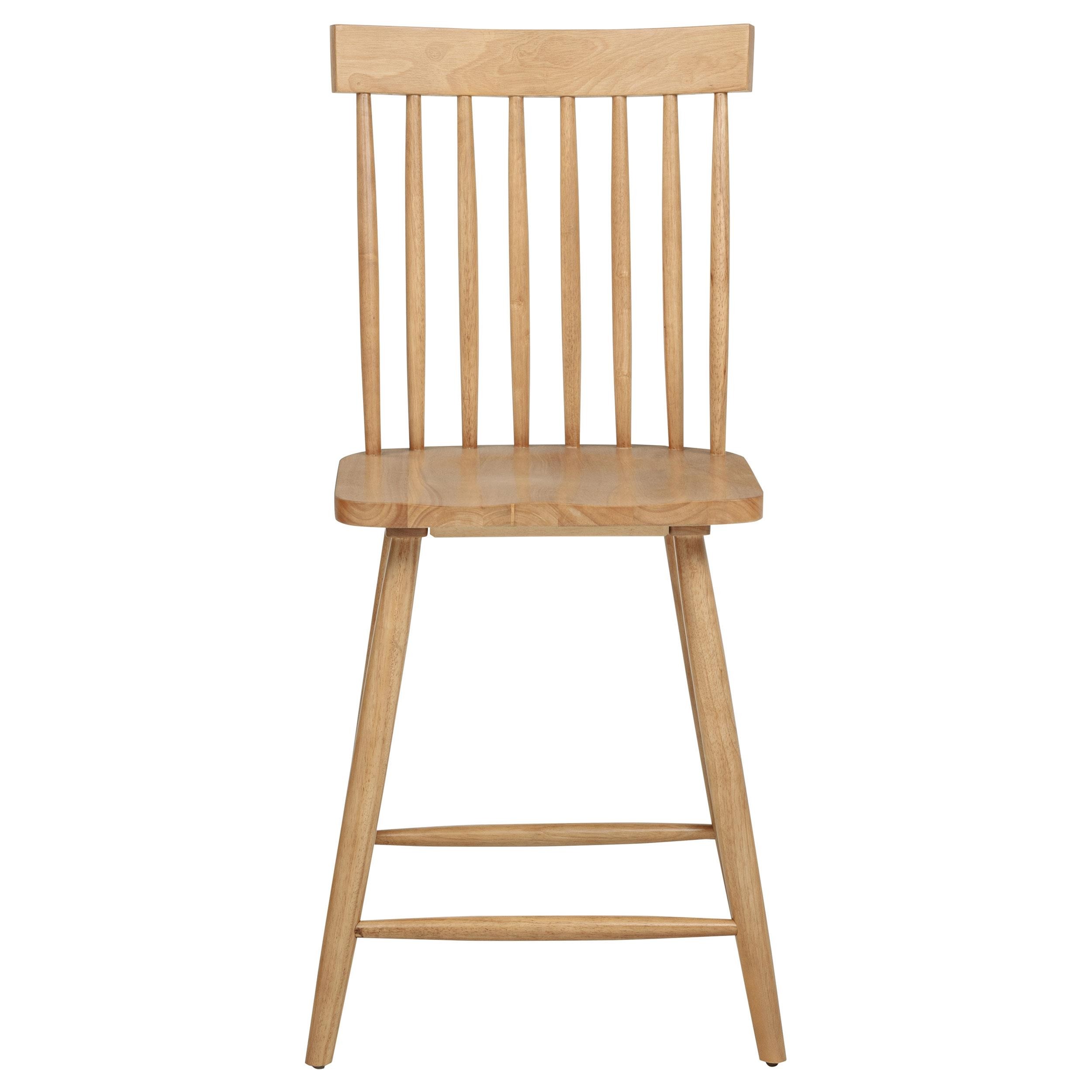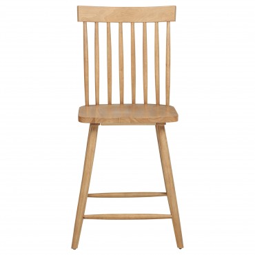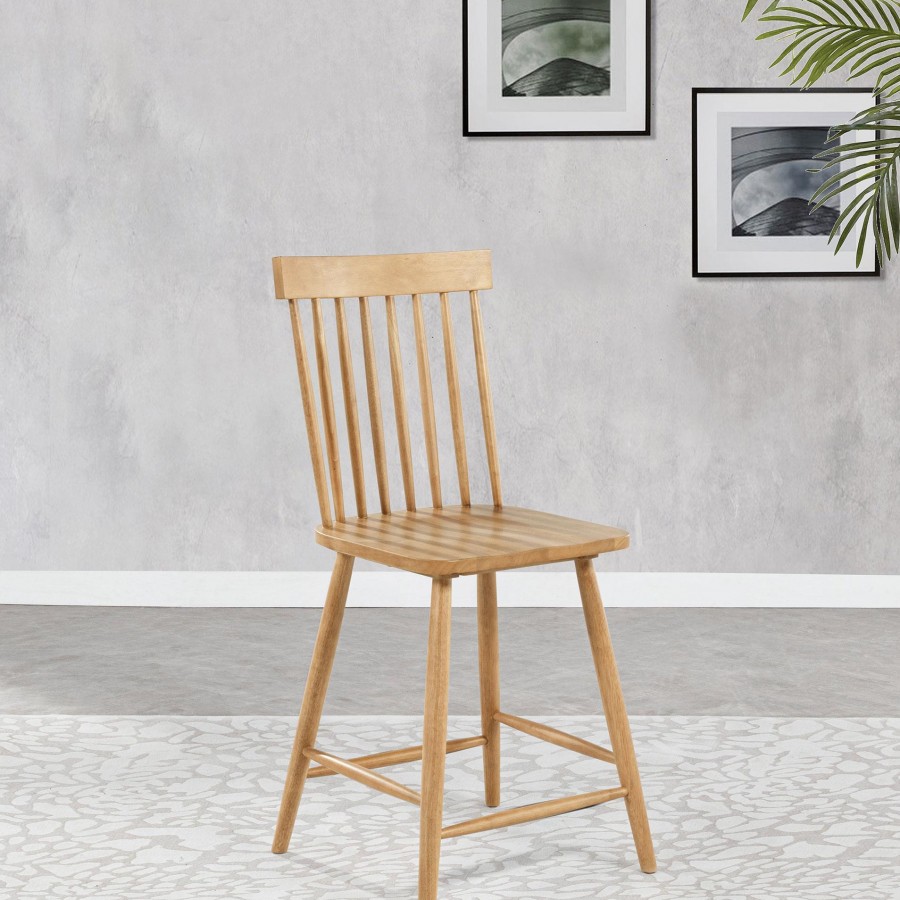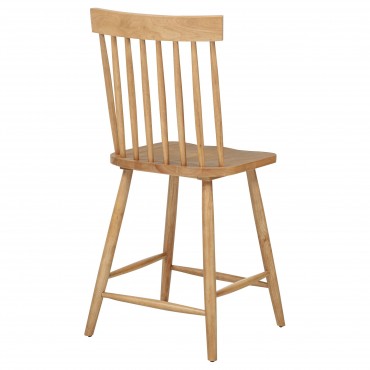 Classic and casual with a fresh farmhouse flair, this Windsor-style counter height chair features a high spindle back and gently contoured seat for timeless comfort. The clean silhouette is crafted from solid rubberwood with a rich wood veneer that enhances its natural grain. Angled legs with double stretchers offer reliable support and charm. Ideal for kitchen islands, pub tables, or counter-height dining spaces.