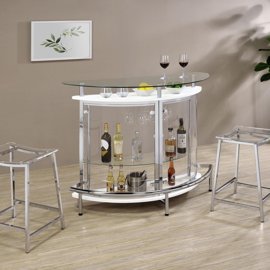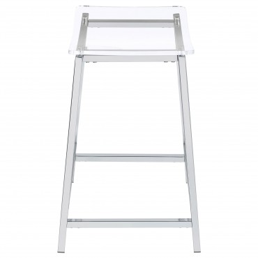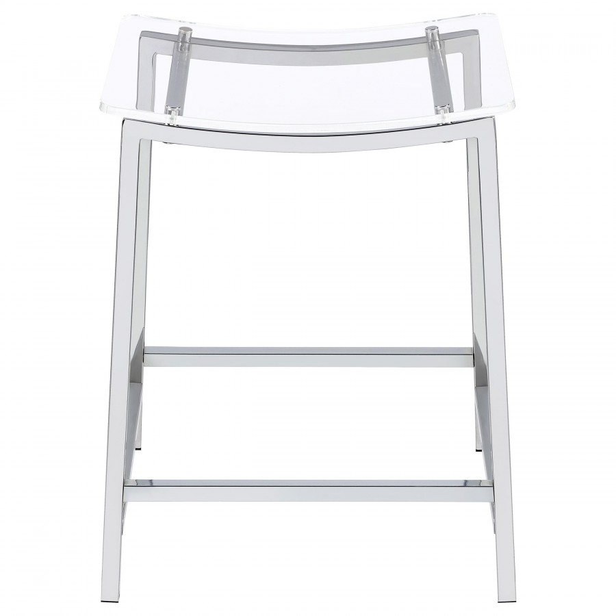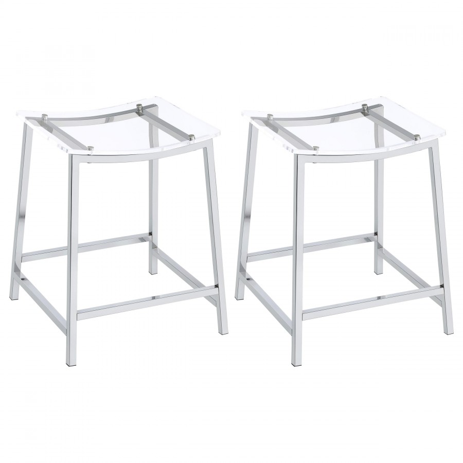 Pull up a stool and enjoy a casual modern entertaining experience from the privacy of your home. This set of two counter-height stools reflects ultra-contemporary design standards using crisp modern materials. Gleaming chrome finish metal framing includes a two-bar seat support and built-in footrests. A gently curved seat made of acrylic reveals the nuts and bolts of metal framing. Add this stool set to a sleek kitchen island or lounge space.