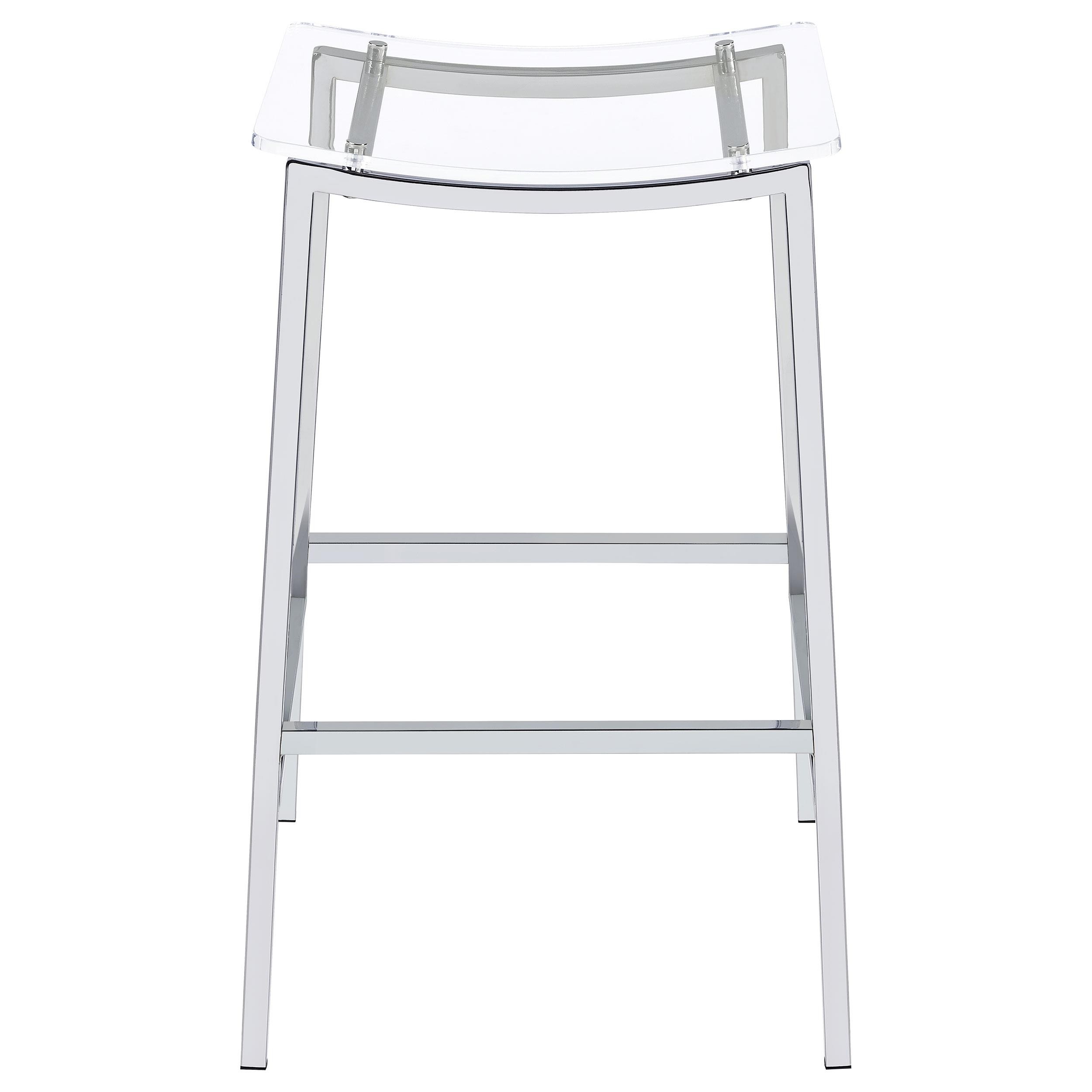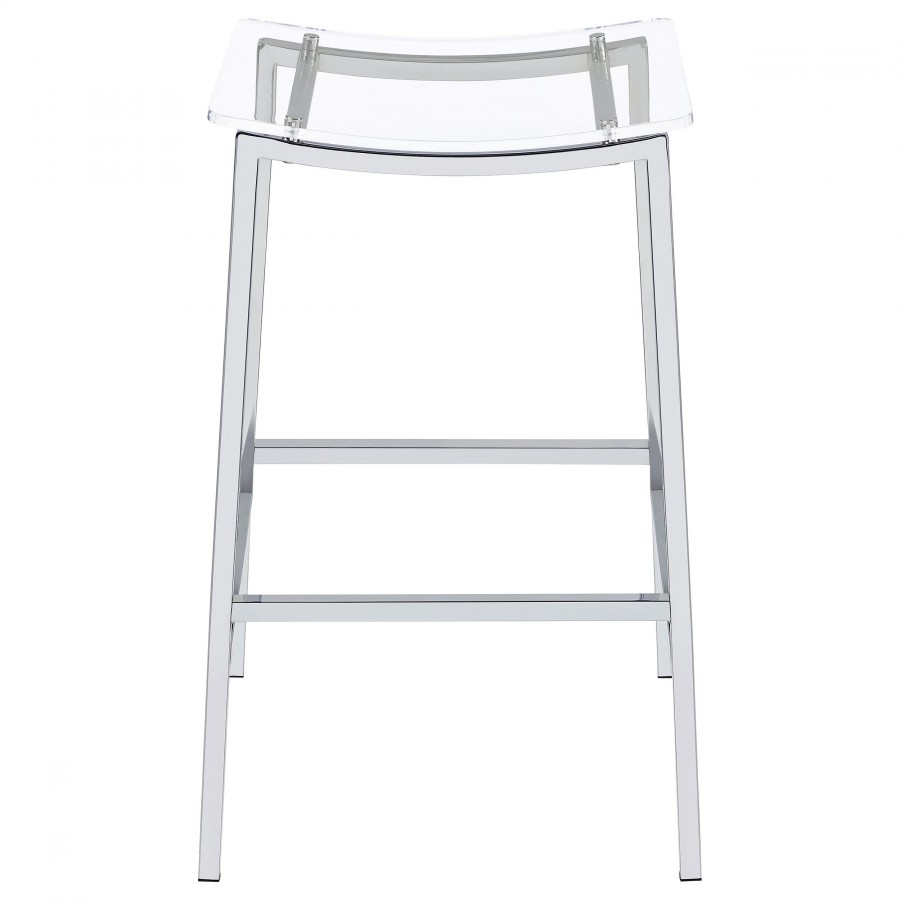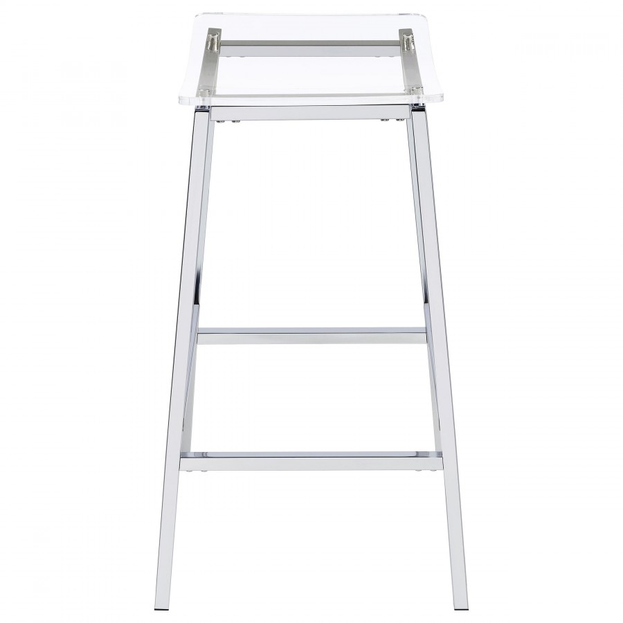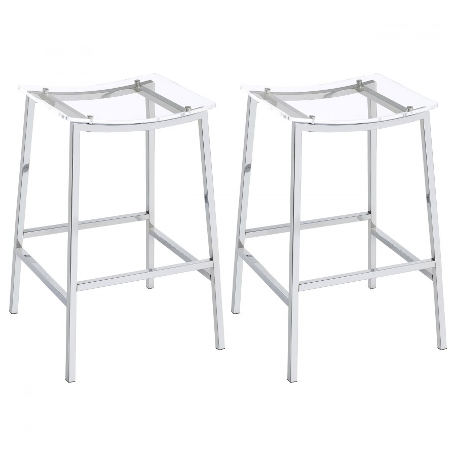 Updated to reflect the carefree contemporary style you crave, this set of two bar stools uses modern materials and finishes to bring a crisp look. Perfect for casual seating at a bar table or counter, these stools are lightweight yet sturdy. Gleaming chrome finish metal framing includes a two-bar seat support and built-in footrests. A gently curved seat made of acrylic reveals the nuts and bolts of metal framing. Add this bar stool set to your easy-living space for entertaining and family meals.
