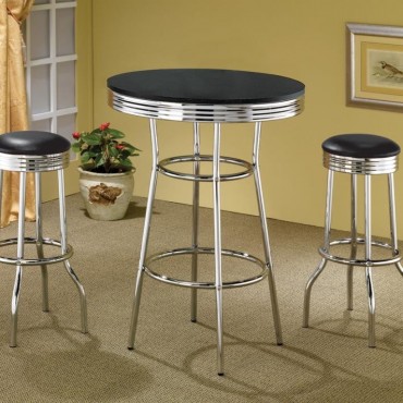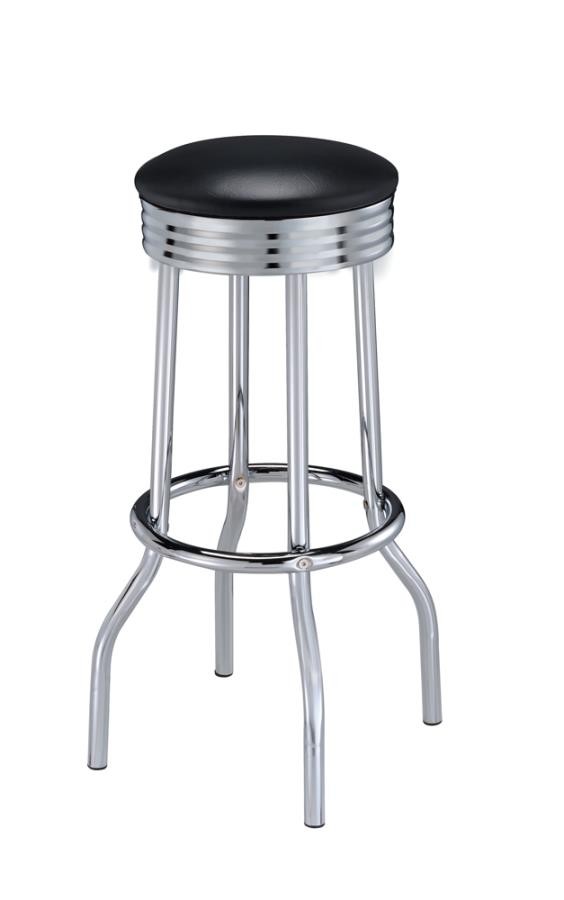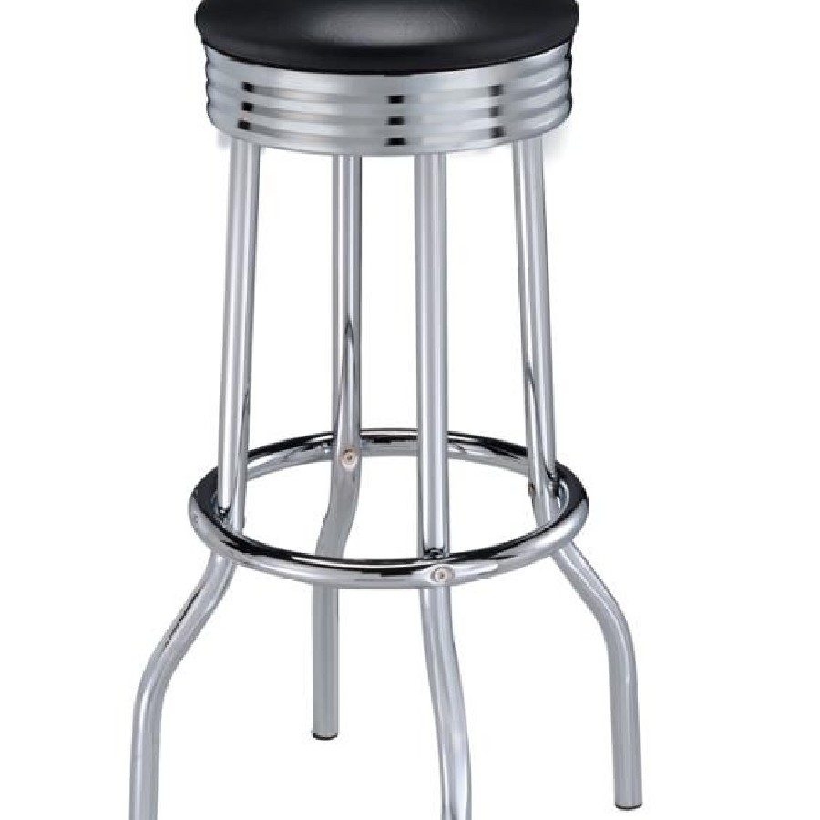 Channel the charm of a classic soda shop with this vintage-style swivel bar stool. A cushioned black leatherette seat crowns the top, resting on a polished electroplated chrome base with ribbed apron detailing. The flared legs and circular footrest reinforce the retro aesthetic while offering stability and ease. Crafted from heavy gauge metal with smooth 360-degree swivel, this nostalgic piece combines comfort, durability, and timeless appeal.