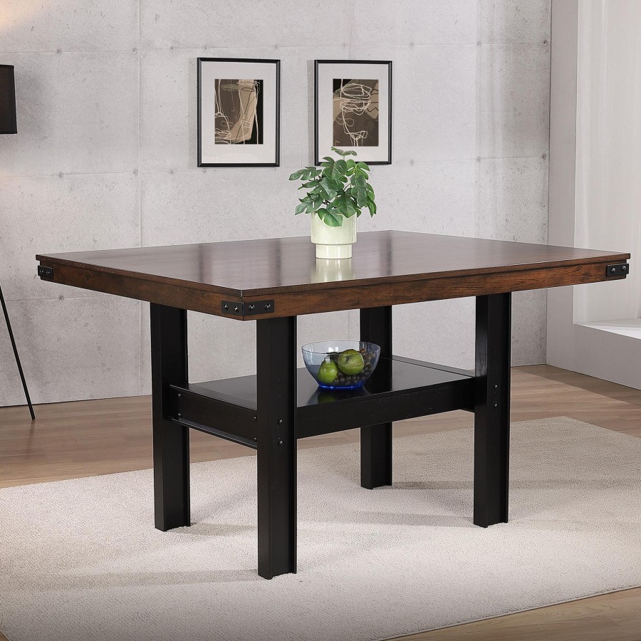 Center a stylish, inviting dining space around this modern industrial counter height dining table. It's a fresh, two-tone design with charming details that offer elevated aesthetics in your kitchen or dining room. The table features a rectangular top crafted with sap walnut veneer in a mango oak brown wood grain finish. Strap and bolthead details add charm to the apron, creating a sense of texture and dimensionality. The base of the table takes a page from architectural framing and offers a black finish and a shelf that's perfect for stashing essentials.