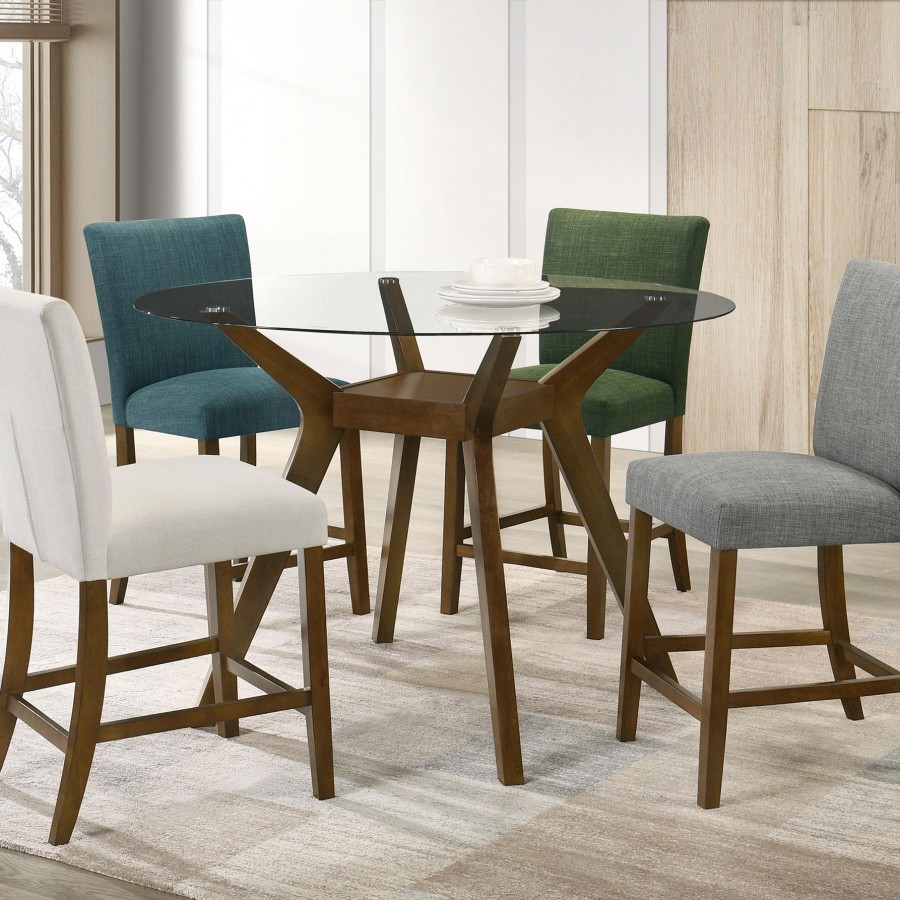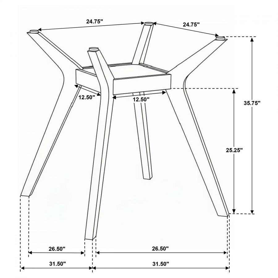 This counter height dining table base delivers sculptural form and balanced geometry through a distinctly mid-century profile. Four angular, boomerang-inspired wood legs extend upward and converge at a square center shelf, creating a stable foundation with strong visual symmetry. Crafted from solid rubberwood and finished in a warm brown tone, the base offers durability and refined character. Designed for versatility, the counter height structure allows pairing with a variety of glass tabletop shapes and sizes, giving flexibility to create a customized dining surface that fits both space and style.