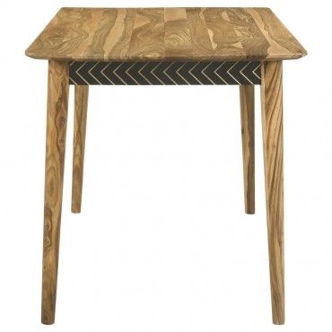 A perfect addition to contemporary homes, this mid-century style counter height table creates a warmth to a dining area with its solid natural Sheesha wood frame. Graceful curved edges and a 45-degree chamfered profile lend a softness and elegance to this furniture piece. Along the apron of this charming contemporary dining piece is an arrow-inspired graphical design in a contrasting black hue that lends a playful touch. Supported by long slender legs that taper toward the feet, this counter height table pushes the vintage vibes. Pull up a counter height stool or chair to seat six family members or guests comfortably.