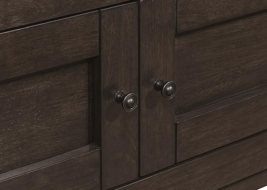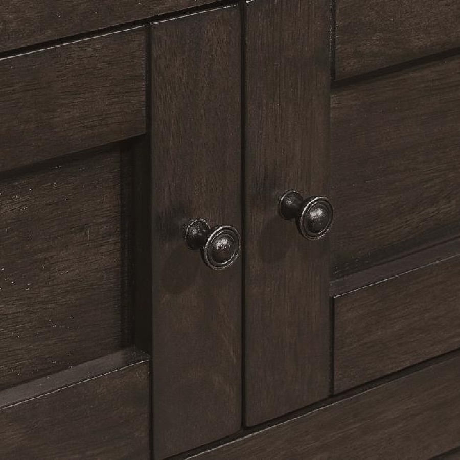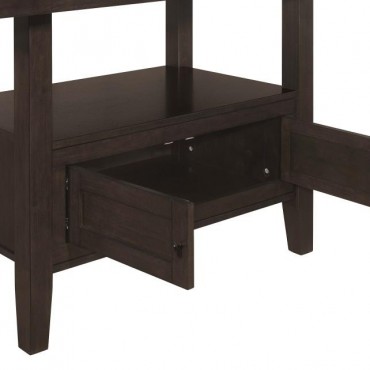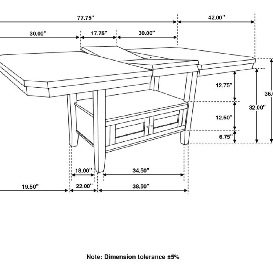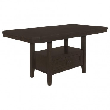 Create a more casual dining experience for family and guests with this elegant, rectangular counter height table. A rich, cappuccino finish brings a warm brown hue for a traditional touch. Designed with a large storage base, it also offers plenty of space below to keep your dining essentials. Four cabinet doors adorned with shiny metal knobs open to reveal a roomy interior, while an open bottom shelf presents a space to display cookbooks. Invite extra guests to dinner, extending the butterfly leaf.