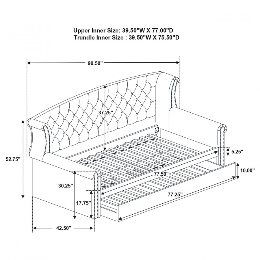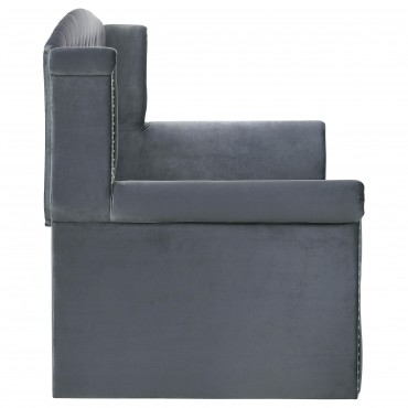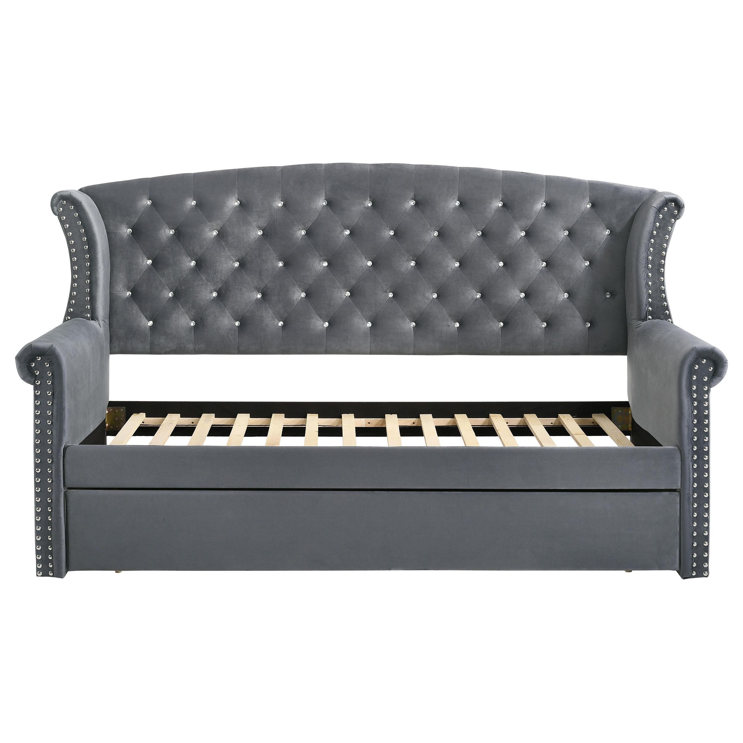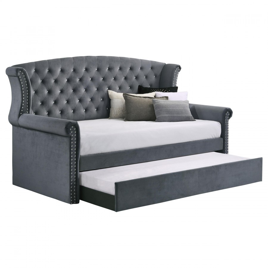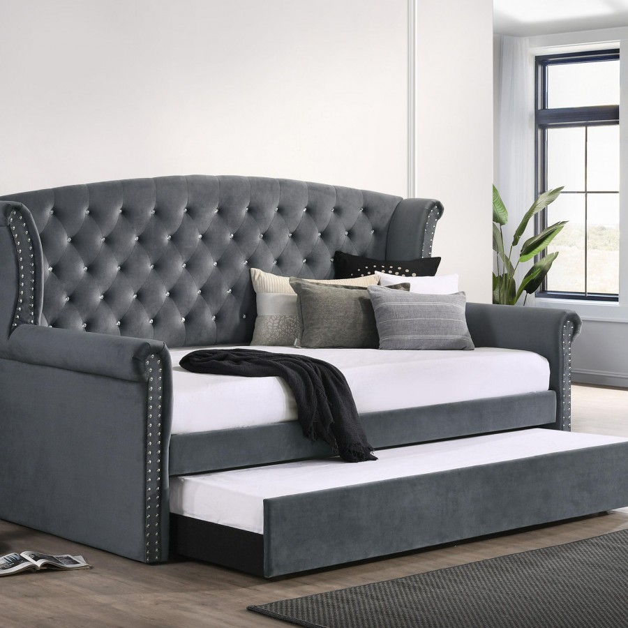 Wrapped in a soft velvet that lends versatility in existing color palettes, this upholstered twin daybed is the perfect addition to a combined home office guestroom. With a twin size daybed on top and a trundle beneath, this daybed can accommodate extra guests effortlessly. Plus, with its graceful frame of traditional rolled arms and a wingback design complete with glimmering button-tufted details and polished chrome nailhead trim, this daybed provides elegant style to a space. Pull out the trundle when guests come to visit or throw accent pillows along the back to create a spacious seating area. With a neutral color and versatile style, this twin daybed and trundle work with all sorts of existing colors and decor too.