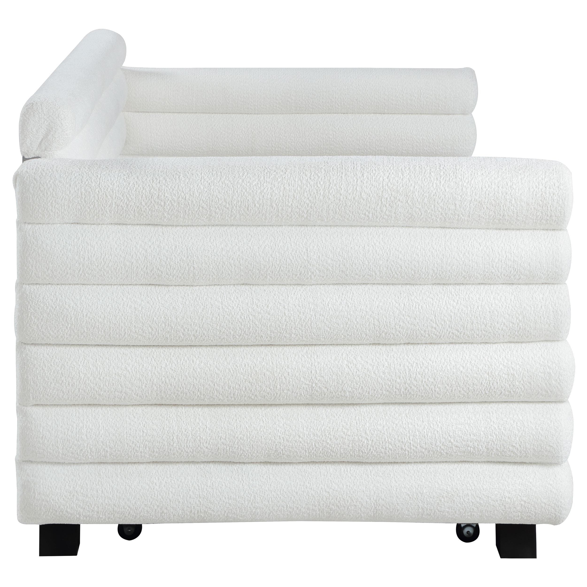 You're going to love the intriguing silhouette and boucle upholstery featured on this modern daybed and trundle. Offering contemporary flair, the daybed is designed with layered round bolsters, creating exceptional texture and dimensionality in your living room or den. Boucle upholstery is fresh and modern, creating inviting texture and character. The bed and trundle are twin-sized, offering easy lounging on a daily basis, or creating space for a pair of overnight guests. This stylish daybed offers the perfect combination of impressive style and wonderful versatility.