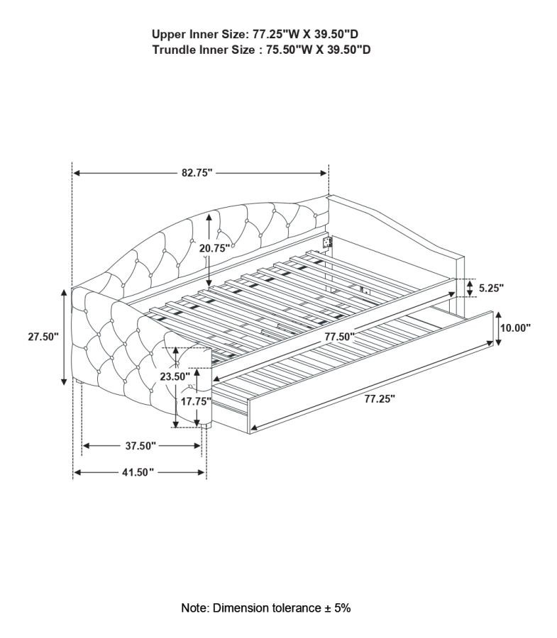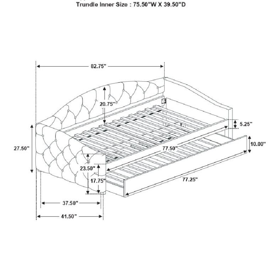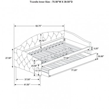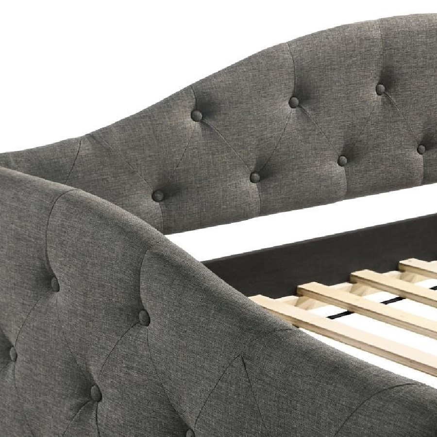Sweeping lines and timeless details come together in this transitional twin daybed and trundle set. Wrapped in a soft fabric that coordinates with all sorts of color palettes, this daybed and trundle combo lends traditional elements such as a button-tufted back and sides. Thin sloped sides and a camelback offer a graceful design and feminine charm to compact rooms where additional sleeping arrangements come in handy. Tucked beneath the main frame is a hidden trundle set, easily retrievable and concealed by a smooth padded panel. Black legs elevate the trundle bed ever so slightly, allowing finished floors and colorful rugs to shine through.