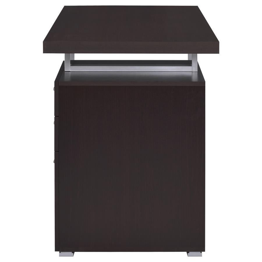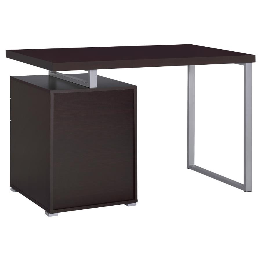 Streamline your workspace with this modern office desk that combines function and style. Supported by a sturdy silver metal frame, the design features a spacious work surface along with two storage drawers and a file cabinet that accommodates both legal and letter-sized documents. A reversible configuration allows you to set up the storage pedestal on either side, providing flexibility for any layout. Crafted with engineered wood and laminate veneer, this desk balances durability with sleek contemporary appeal.