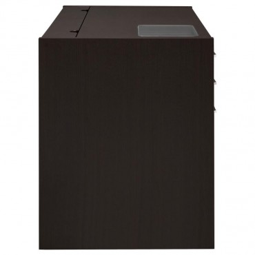 Upgrade your workspace with the Halston computer desk, offering a blend of functionality and modern design. Finished in rich cappuccino, this rectangular desk features two drawers, a keyboard tray with smooth Euro glides, and a cabinet with an adjustable shelf for versatile storage. A clear tempered glass inset on the top allows visibility of devices, while a lift-top compartment conceals a convenient built-in power outlet. Its streamlined form and durable engineered wood construction make it ideal for any contemporary home office.