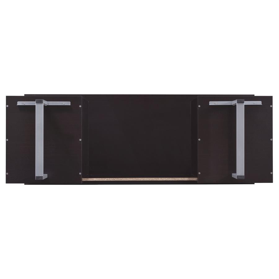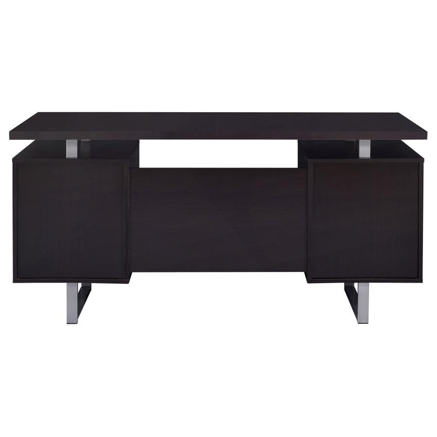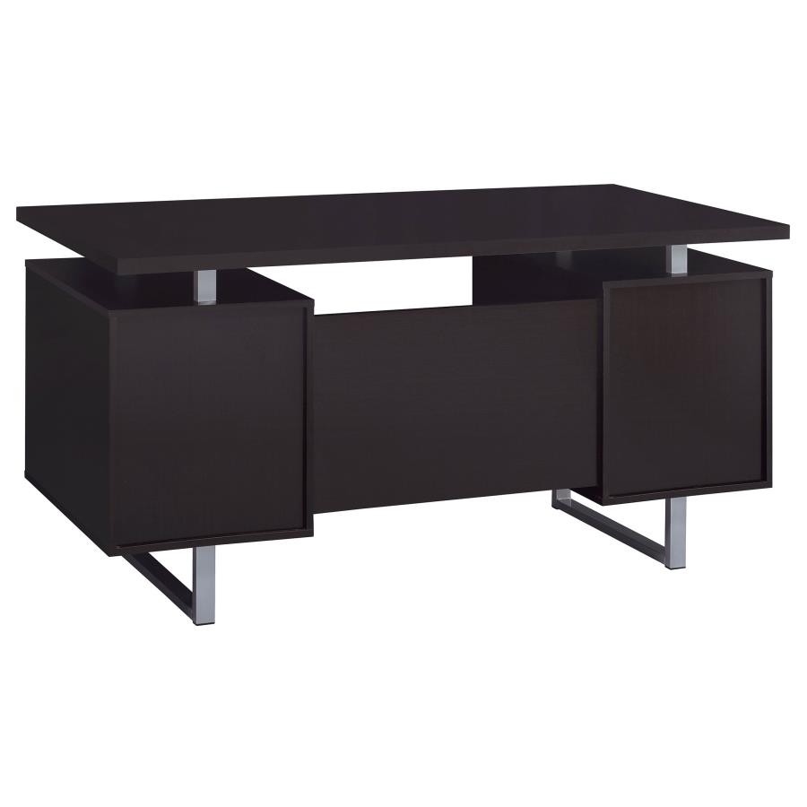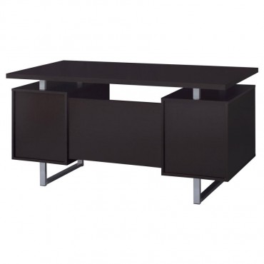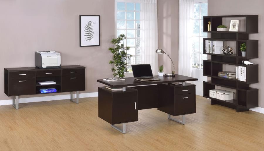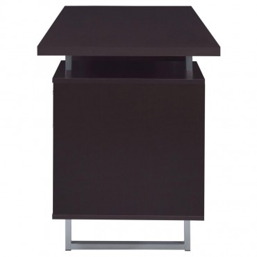 Enjoy an intriguing architectural design in this office desk. A floating top creates a visually enticing effect and a completely different look. Finished in cappuccino, it flatters surrounding decor and delivers a dramatic touch. Store essentials in a cabinet and drawer, and use a file cabinet to organize papers. Contrasting silver hardware and steel legs plays up the contemporary flavor of this stylish desk.