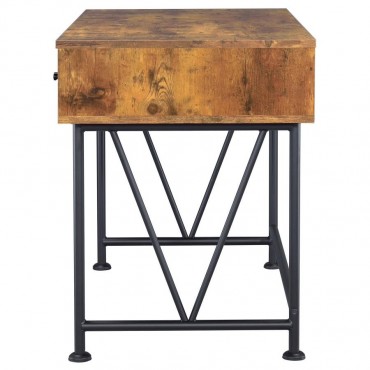 This writing desk blends industrial charm with practical function, featuring a spacious tabletop in a rustic nutmeg wood look. A sturdy metal frame with powder-coated black finish ensures lasting durability, while three integrated drawers provide accessible storage for office essentials. Built from metal, engineered wood, and a scratch-resistant laminate veneer, this desk is ideal for home office, study, or creative spaces.